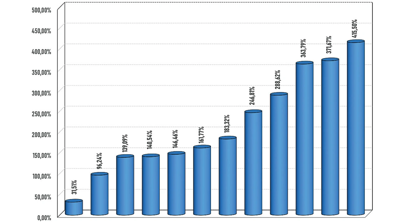Physikalisch bedingt ist bei jedem Halbleiter eine gewisse Temperaturabhängigkeit gegeben. Auch ein EEPROM bildet hier keine Ausnahme. Bei den Herstellern gibt es erwähnenswerte Abweichungen untereinander. In Bild 7 steht jeder Balken für die prozentuale Temperaturabweichung des +25°C-Tests verglichen mit dem +85°C-Test der jeweiligen Bauteilfamilie. Die Bauteile einiger Hersteller reagieren nur im geringen Maß auf Temperaturunterschiede, während andere Hersteller Abweichungen von über 400 Prozent aufweisen.