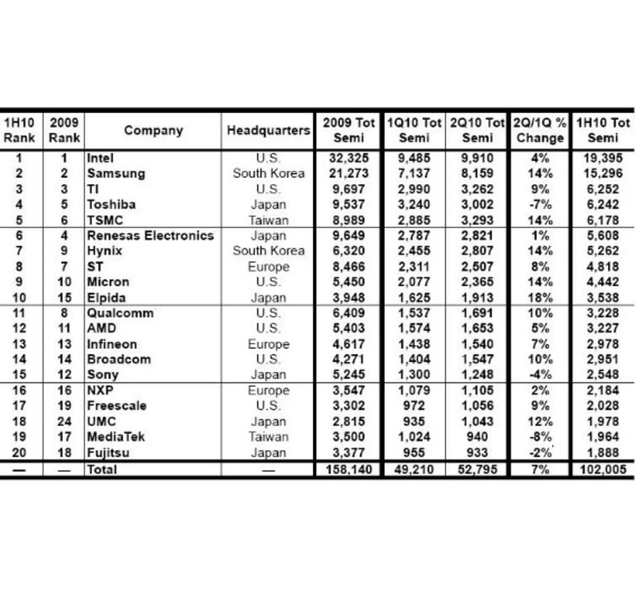 Von den 20 umsatzstärksten Unternehmen des ersten Halbjahres 2010 konnten acht gegenüber dem ersten Quartal zweistellige Zuwächse im 2. Quartal verbuchen, während vier Unternehmen Umsatzverluste hinnehmen mussten. Bis auf Samsung, das hinter Intel ja ohnhin schon auf Position 2 steht, konnten alle anderen Top-Speicherhersteller (Toshiba, Hynix, Micron und Elpida) mindestens einen Platz in der Tabelle gut machen, wobei Elpida sogar von Platz 15 auf Platz 10 aufstieg. Samsung hat den Abstand zu Marktführer Intel weiter verkleinert. Während 2009 Intel noch 52 % mehr Umsatz als Samsung generieren konnte, reduzierte sich der Vorsprung im 2. Quartal 2010 auf nur noch 21 %.