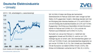 Mit 14,8 Mrd. Euro traten die Erlöse der heimischen Elektrobranche im Februar 2020 mehr oder weniger auf der Stelle (–0,2 % gegenüber Vorjahr). Allerdings standen sich hier ein Rückgang des Inlandsumsatzes um 3,1 % auf 6,9 Mrd. Euro und ein Anstieg des Auslandsumsatzes um 2,5 % auf 7,9 Mrd. Euro gegenüber. Die Erlöse aus Geschäften mit dem Euroraum kamen im Februar auf 2,9 Mrd. Euro (+1,2 %) und die mit Partnern aus Drittländern auf 5,0 Mrd. Euro (+3,2%).