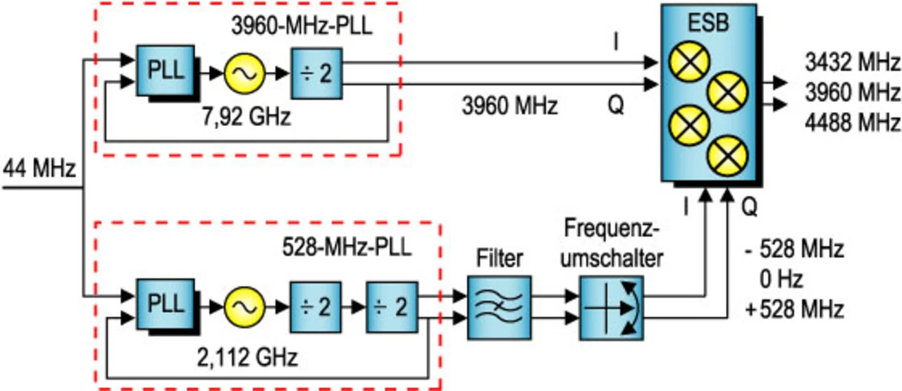 Die gewählte Schaltung für den Frequenzsynthesizer verwendet zwei Quadratur-PLLs für I und Q; eine davon erzeugt eine Überlagerungs-Oszillatorfrequenz für das mittlere Teilband (3960 MHz), die andere eine dem Abstand der Teilbänder entsprechende Frequenz (528 MHz). Anschließend werden die Überlagerungs-Oszillatorfrequenzen für das obere und untere Teilband erzeugt, indem die Ausgangssignale dieser beiden PLLs gemischt werden – in einem Einseitenband-Mischer (ESB). Hier-bei wird das Vorzeichen der Frequenz 528 MHz umgekehrt, um die Trägersignale für das obere und untere Teilband zu erzeugen (3960 MHz + 528 MHz = 4488 MHz und 3960 MHz – 528 MHz = 3432 MHz). Anschließend wird das 3960-MHz-Signal um 0 Hz verschoben, um die Überlagerungs-Oszillatorfrequenz für das mittlere Teilband zu erzeugen. Mit dieser Schaltung kann der Frequenzwechsel in weniger als 1 ns erfolgen.