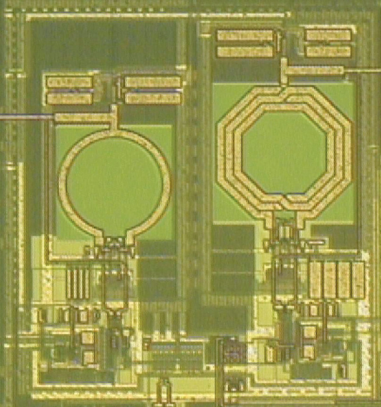 Bis etwa 13 GHz sind hiermit hervorragende Verstärkungs- und Rauschwerte möglich; dadurch ist diese Empfangsstufe geeignet für den gesamten UWB-Frequenzbereich von 3,1 GHz bis 10,6 GHz. Der komplette Testchip-Empfänger hat bei einer Versorgungsspannung von 2,7 V eine Stromaufnahme von weniger als 80 mA; etwa 47 mA entfallen hier auf den Empfangsteil, 27 mA auf den Mehrfachton-Generator. Bild 4 zeigt Großaufnahmen der beiden Testchips.