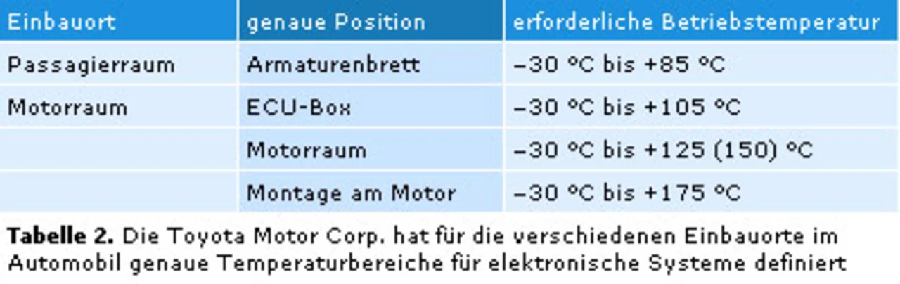 Aber nicht nur die thermische Energie pro Bauteilvolumen steigt. Die Elektronikschaltungen stoßen auch in solche Einsatzgebiete innerhalb des Autos vor, wo höhere Temperaturen vorherrschen: vom Inneren des Getriebes (200 °C) über die Montage am Zündkerzenstecker (165 °C), den Motorraum (150 °C) bis hin zum Einsatz im relativ harmlosen Umfeld des Passagierraums (maximal 80 °C). Man geht davon aus, dass ein Auto im Laufe seines Lebens in etwa 6000 Kaltstarts bewältigen muss, wobei die Temperatur im Motorraum von –40 °C auf 150 °C ansteigen kann. Aufgabe des Gehäuses ist es auch, das Silizium vor den extremen Temperaturen der Umgebung und den damit verbundenen Beanspruchungen zu schützen.