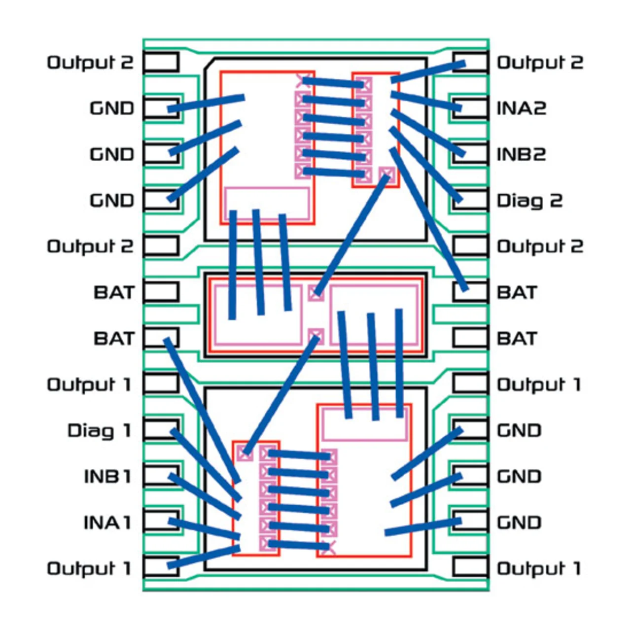 Bild 2 zeigt das Innenleben eines Gehäusekonzepts mit drei Montageflächen und fünf Chips. Ein solches, für mehrere Chips konzipiertes Gehäuse muss die Isolierung der Chip-Substrate gewährleisten, für einen geringen thermischen Widerstand des Leistungs-Chips sorgen und die Möglichkeit bieten, zwei getrennte „Smart Power“-Chips zu verdrahten. Um die Größe der Steuer-Chips auf ein Minimum zu reduzieren, werden die beiden Steuer-Chips dieses Bausteins über jeweils 12 dünne Bonddrähte angeschlossen. Um die Steuer-ICs vom Leistungs-Chip zu isolieren, werden die Steuer-Chips mit einem nicht leitenden Klebstoff aufgeklebt. Dicke Bonddrähte aus Aluminium bewältigen die auftretenden hohen Ströme zum Leistungs-Chip. Um die Verlustwärme abführen zu können, wird der Leistungs-Chip auf die Montagefläche aufgelötet. Diese Lötverbindung mit dem Chipträger und dessen Verbindung mit der Platine sorgen für einen minimalen thermischen Widerstand zwischen Leistungs-Chip und den zur Wärmeableitung eingesetzten Oberflächen.