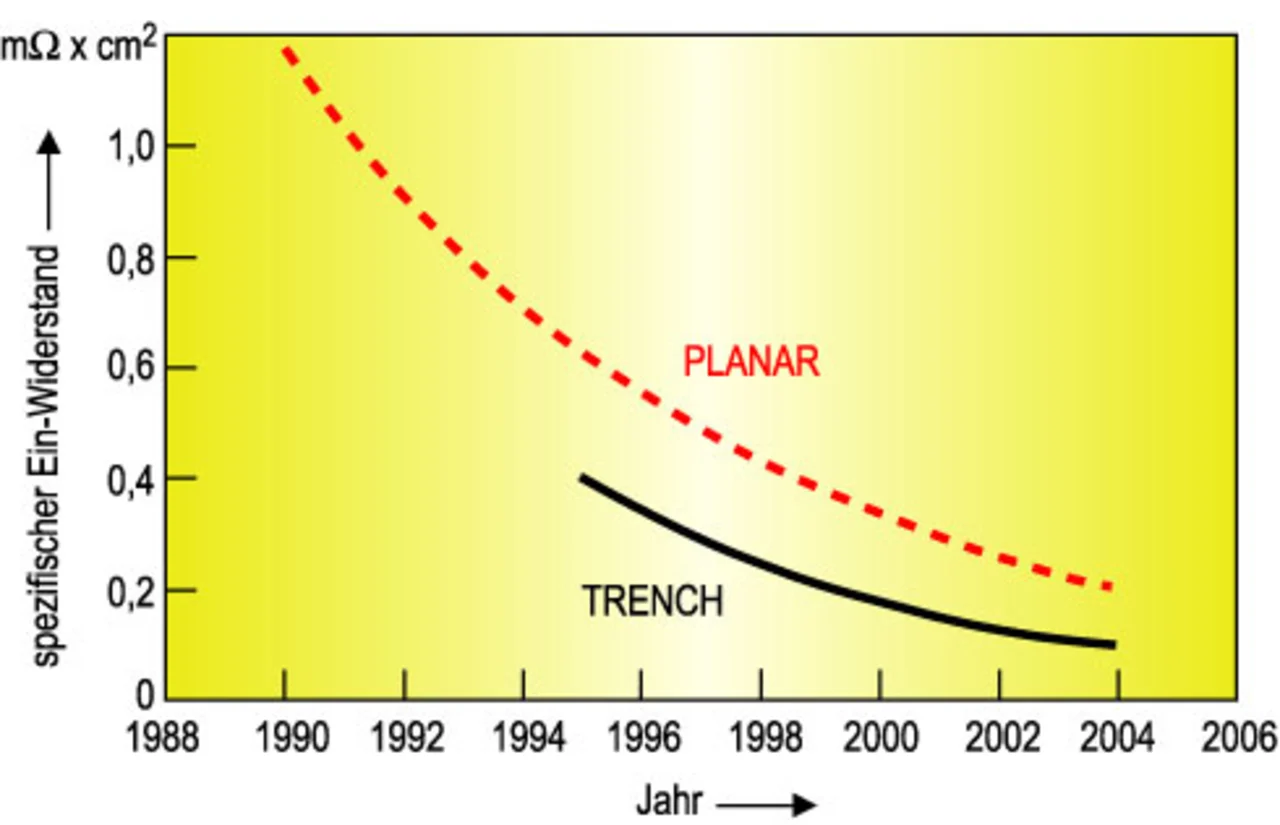 In den letzten Jahren konnte der spezifische Einschalt-Widerstand (RDS(on)) von Leistungs-MOSFETs deutlich verringert werden. Was das Siliziumchip angeht, so geht die Chipfläche als bestimmendes Element in die Faktoren (Uein x Iein) bzw. Rth der Gleichung ein. Dank dieses verbesserten Einschalt-Widerstandes lässt sich ein moderner MOSFET auf einer kleineren Chipfläche realisieren – bei gleichem Einschalt-Widerstand wie ein älterer, größerer MOSFET. Aber dieser kleinere MOSFET weist einen höheren thermischen Widerstand auf. Der Einsatz von Trench-Strukturen und die daraus resultierenden technologischen Verbesserungen haben – wie in Bild 1 dargestellt – zu deutlichen Fortschritten beim spezifischen Ein-Widerstand geführt. Das bedeutet andererseits, dass die Leistungsdichte in den letzten zehn Jahren nahezu um den Faktor zehn gestiegen ist.