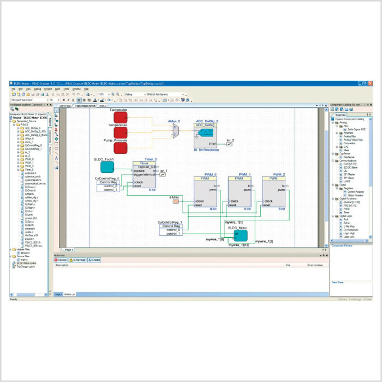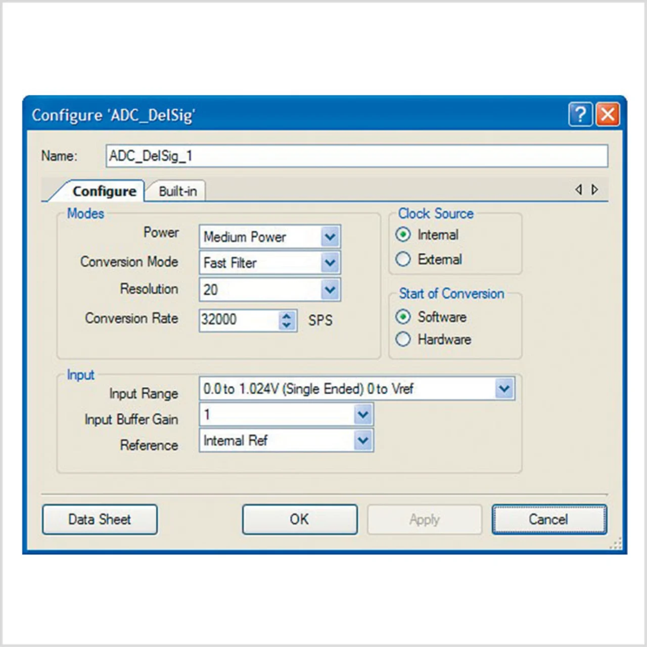 Die Bilder 3 und 5 zeigen, wie analoge Komponenten nur im Drag-and-Drop-Verfahren auf das Arbeitsblatt von PSoC-Creator gezogen werden müssen, gefolgt vom Einstellen der Peripherie-Konfiguration entsprechend der jeweils implementierten Funktion. Im Falle des A/D-Wandlers sind beispielsweise Auflösung, Umwandlungsrate und Taktquelle anzugeben. Genauso einfach gestaltet sich die Einrichtung anderer analoger Peripheriefunktionen (z.B. Transimpedanz-Verstärker, Filter, analoge Multiplexer, Komparatoren, D/A-Wandler).