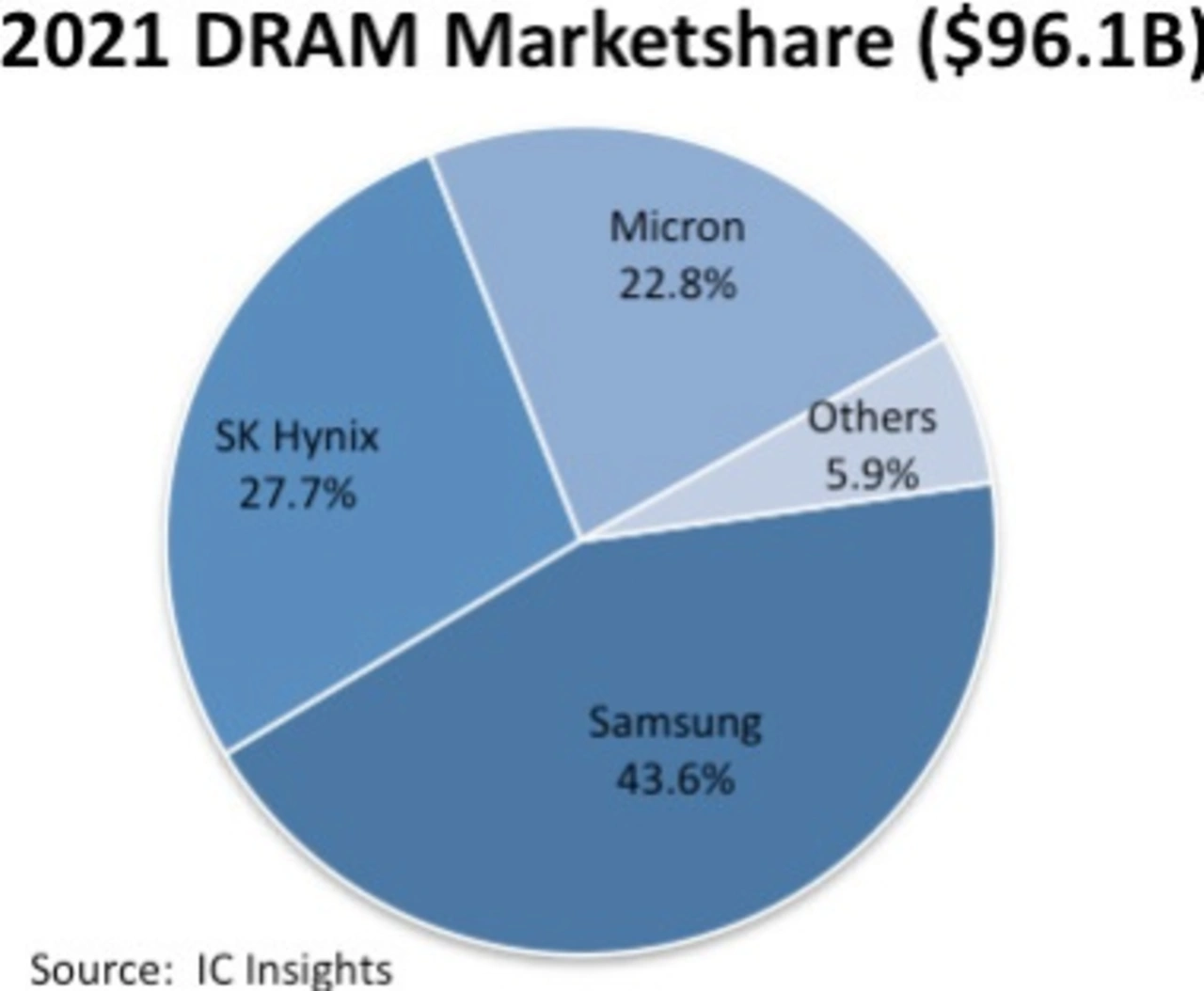 Mit einem Umsatz von knapp 22 Mrd. Dollar und einem Marktanteil von 23 Prozent lag Micron 2021 auf Platz 3 unter den DRAM-Herstellern. Das amerikanische Unternehmen konnte 2021 den Umsatz mit DRAMs um 41 Prozent steigern, der Marktanteil lag 2021 bei 23 Prozent. Insgesamt trugen die DRAMs im vergangenen Jahr 73 Prozent zum Gesamtumsatz in Höhe von 30 Mrd. Dollar bei.