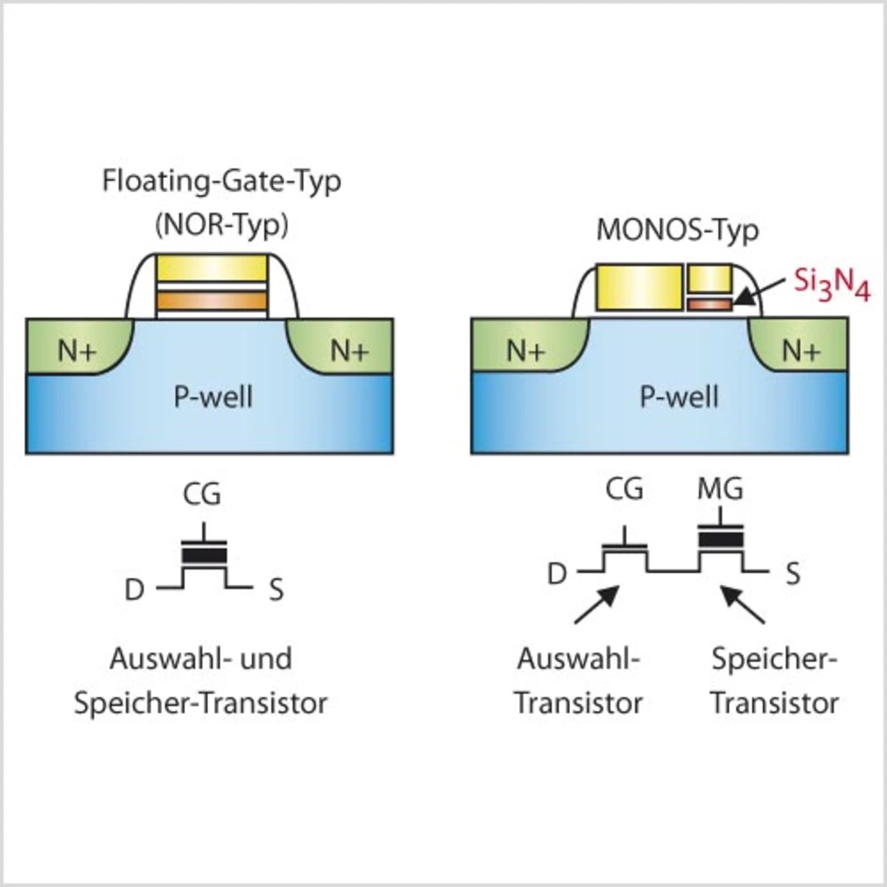 Bild 3 zeigt den Zellenaufbau von MONOS-Flash im Vergleich zu konventionellem NOR-Flash sowie die entsprechenden Ersatzschaltbilder. Die Ladungsträger auf dem Floating-Gate bestimmen, ob eine logische Eins oder eine Null gespeichert ist. Bei herkömmlichem Flash-Speicher ist das Floating-Gate leitend; somit drohen bei Lecks in der Oxidschicht alle Ladungsträger abzufließen. Bei MONOS-Flash findet die Ladungsträgerspeicherung in einer Speicherschicht um das Nitrid (Si3N4) herum statt, die nichtleitend ist, womit das Problem beseitigt ist.