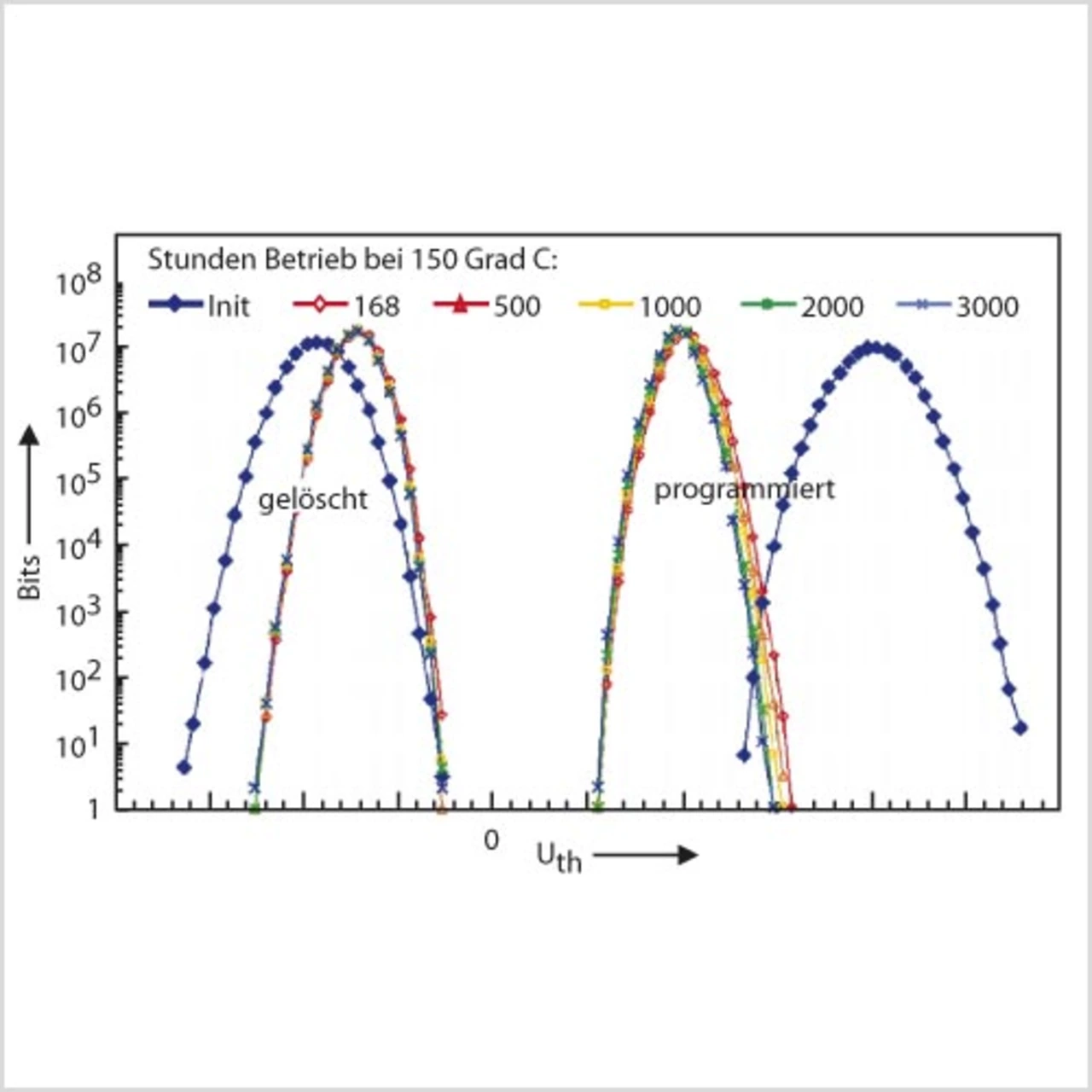 Durch dieses Verhalten von MONOS-Flash ist ein hochzuverlässiger Betrieb bei hohen Temperaturen zu erreichen, den beispielsweise Automobilzulieferer für Verbrennungsmotorsteuerungen verlangen. Das Bild zeigt weiterhin, dass der Abstand der Gelöscht/Programmiert-Kurven selbst nach 3000 Stunden Betrieb bei +150 °C groß ist und bemerkenswerterweise immer noch keine Ausreißer zeigt. fr