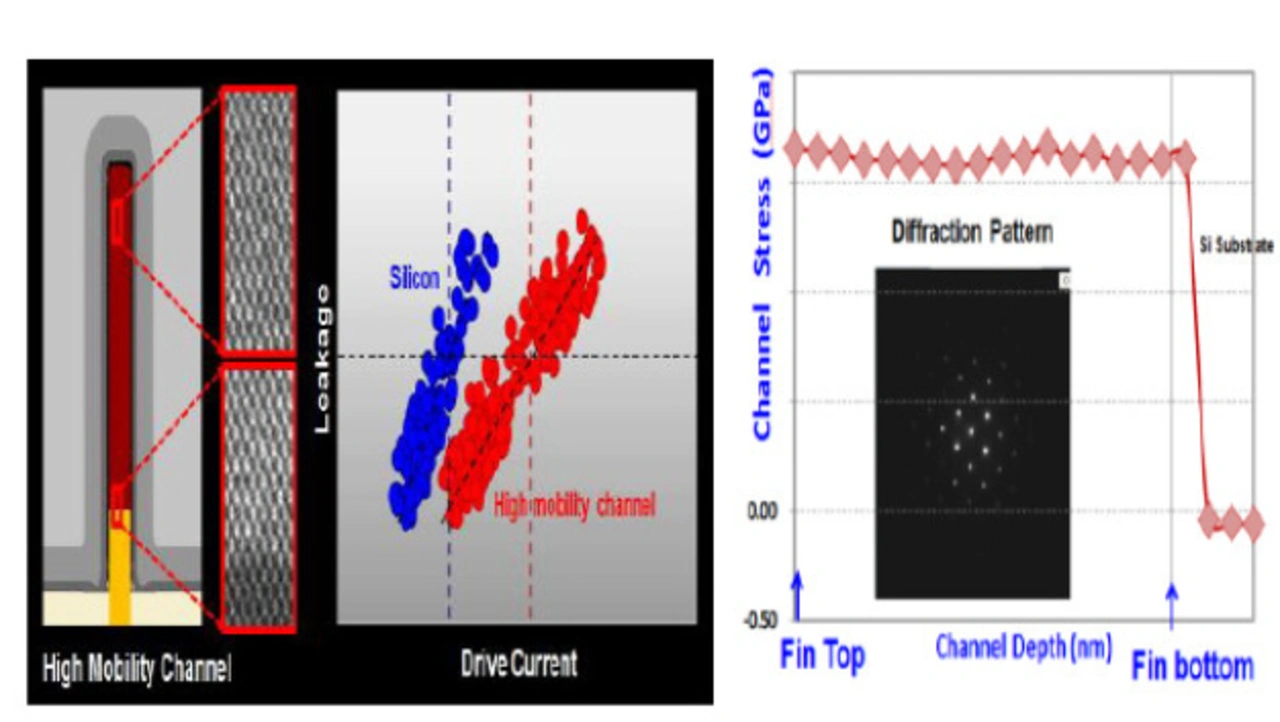 Vier Generationen von Si-FinFETs wurden vom 16-nm Knoten bis zum 7-nm Knoten eingesetzt. Die Leistungsfähigkeit von FinFETs stagnierte, und ein Transistor mit hoher Ladungsträgermobilität im Kanal (HMC) wird genutzt, um die dringend benötigte Verbesserung der Treiberströme zu erreichen. HMC-FinFETs zeigen ausgezeichnete Id-Vg-Eigenschaften. Die Standby-Leistung des Ringoszillators nach dem Figure-of-Merit (FOM) Prinzip korreliert ebenfalls gut mit Transistorleckströmen. Der HMC-FinFET liefert nachweislich einen ca. 18 % höheren Treiberstrom als der Si FinFET. Eine TEM-Analyse zeigt eine vollständig gespannte (strained) HMC-Gitterkonstante, die sich mit der Si-Gitterkonstante verbindet. Das Beugungsmuster bestätigte die HMC-Dehnung. Die Leistungsfähigkeit der Technologie ist auch entscheidend vom Backend-Metall RC und dem Via-Widerstand abhängig. Die engsten Pitch-Mx RC und Vx Rc blieben relativ ähnlich wie beim vorherigen 7-nm-Knoten, wobei EUV-Strukturierung, innovative skalierte Barrieren/Liner, ESL/ELK-Dielektrika und Cu-Reflow genutzt wurden.