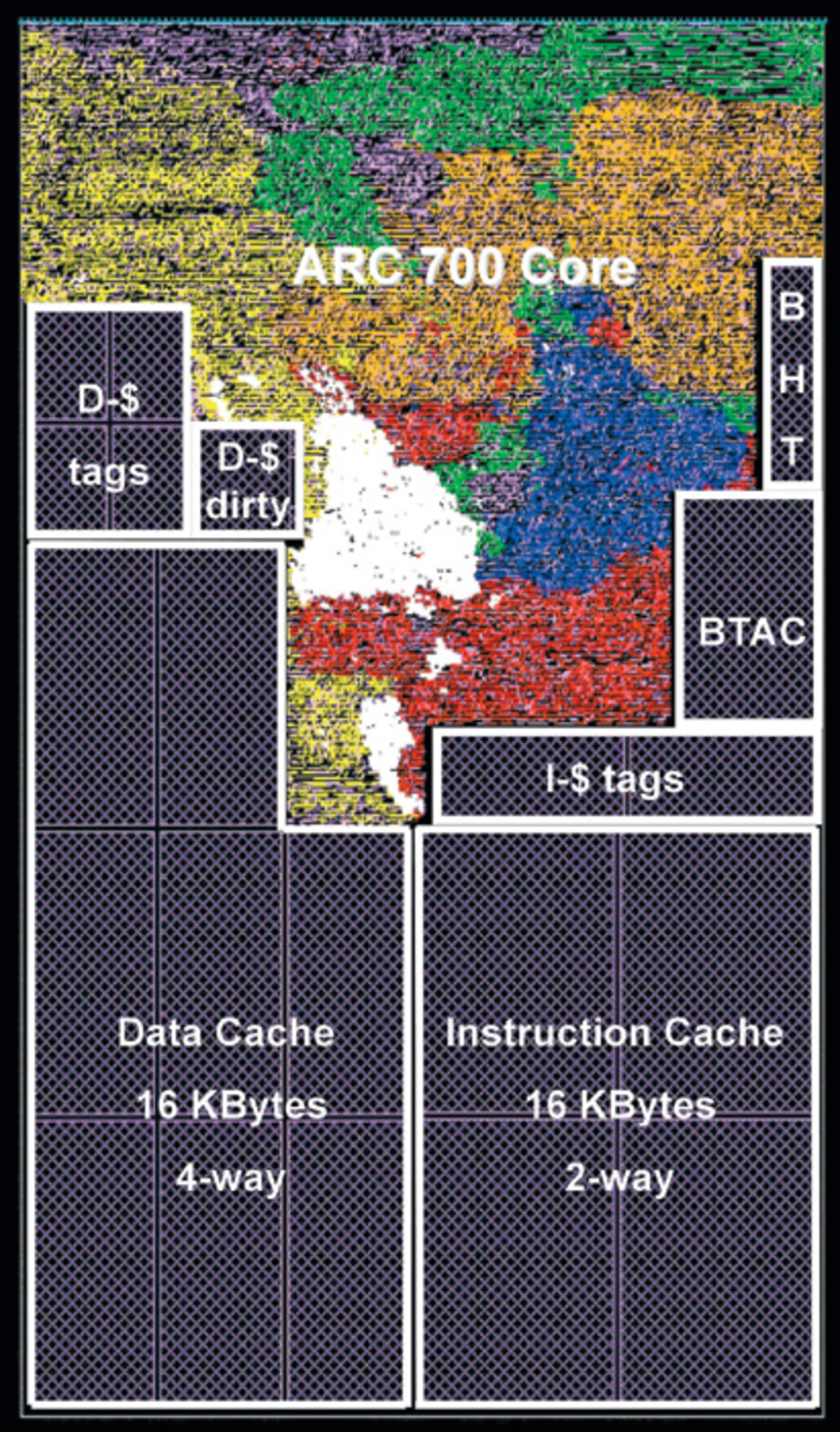 All diese Veränderungen ermöglichen es der Core-Familie 700, die kritischen Anforderungen in punkto Taktfrequenz zu erfüllen, die für eine Direkt-Ansteuerung von DDR2-Speichern erforderlich sind. Auch das Betriebssystem wird davon profitieren. Die ARC-Cores der Serie 700 unterstützen ThreadX, MQX, Java, µltron, µCLinux und Embedded-Linux. Bild 4 zeigt das Chip-Lay-out einer auf maximale Taktfrequenz getrimmten ARC700-Implementierung.