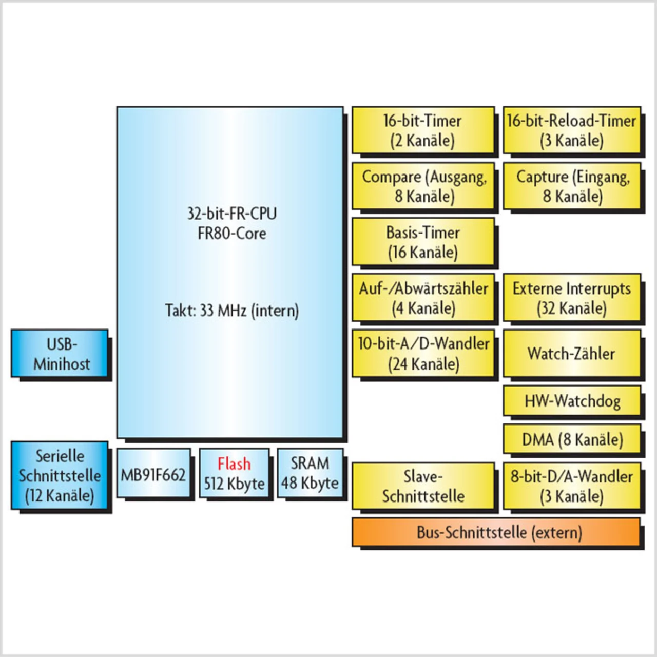 Das auf dem Starterkit verwendete Derivat MB91F662 (Bild 3) arbeitet mit bis zu 33 MHz, die von einer integrierten PLL erzeugt werden, und verfügt über 512 Kbyte Flash- sowie 48 Kbyte RAM-Speicher, die bei Bedarf über einen externen Bus erweitert werden können. Der Mikrocontroller bringt sowohl die USB-Device- als auch die Host-Schnittstelle mit. Alle 16-bit- und 32-bit-USB-Mikrocontroller von Fujitsu besitzen einen Host in kompletter Implementierung. Die früher als Minihost bezeichnete Schnittstelle ist nun als Host freigegeben, unterstützt also die HUB-Funktion (kann mehrere USB-Endgeräte über einen HUB ansteuern). Des Weiteren wird nun auch isochroner Datenverkehr unterstützt.