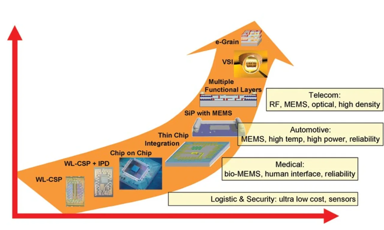 In der Hetero-Systemintegration werden Komponenten unterschiedlichster Komplexität und Funktionsumfangs für elektrische und nichtelektrische Signaldetektion, elektrische Signal- und Datenverarbeitung, drahtlose Kommunikation, Energieversorgung und Speicher zu einem einheitlichen Gesamtsystem in einem Gehäuse kombiniert (Bild 1). Um den Forderungen nach einem hohen Funktionsumfang bei minimaler Größe und Gewicht und geringen Herstellungskosten gerecht zu werden, besteht die Notwendigkeit, modernste Technologien einzusetzen. Das Konzept der Hetero-Systemintegration ist von besonderer Bedeutung, da es im Vergleich zu SoC ein geringeres Risiko bei gleichzeitig niedrigeren Herstellungskosten ermöglicht. Ein weiterer Vorteil der Hetero-Systemintegration liegt damit in der kürzeren Herstellungsphase und somit auch in der Möglichkeit der schnelleren Markteinführung neuer Produkte bei gleichzeitig hoher Flexibilität. Systemintegration ist heute der Schlüssel für die Realisierung moderner Produkte und die Quelle für Innovationen.