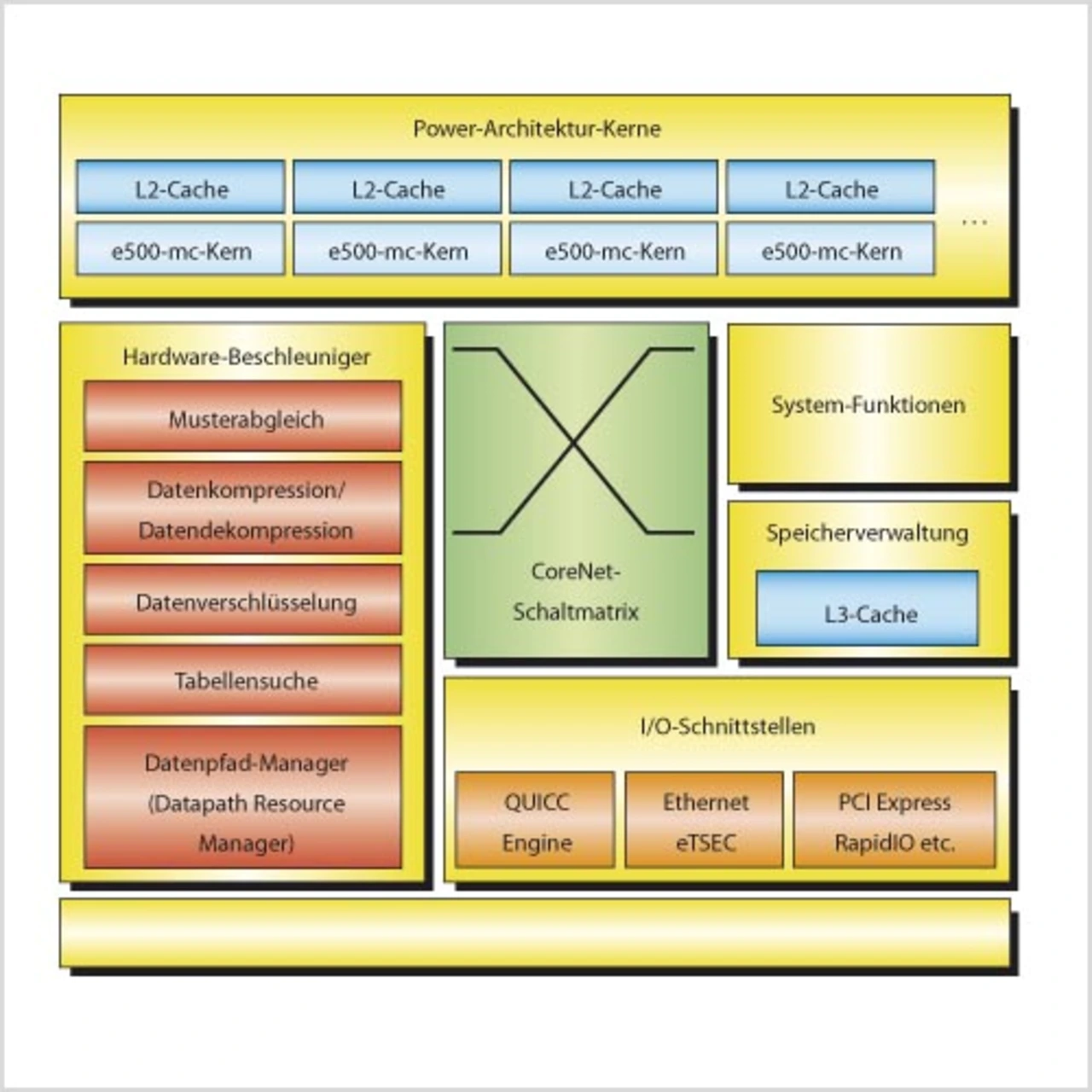 Beim Prozessor-Core soll es sich um eine Weiterentwicklung des e500- Cores handeln. Dieser soll einen eigenen Level 2-Cache erhalten, den er sich nicht mit anderen Cores teilen muss, wodurch der Datenverkehr auf dem Bus zwischen den Cores erheblich reduziert wird. Stattdessen wird ein mehrere Mbyte großer geteilter Level-3-Cache eingeführt, um die Vorteile von privaten und geteilten Caches zu vereinen. Bei dem Power e500 handelt es sich um einen superskalaren 32-bit-Prozessor, der bei einer Chipfertigung mit SOI-Transistoren in einem 45-nm-CMOS-Prozess Taktfrequenzen zwischen 1,8 und 2,0 GHz erreichen dürfte. Damit sind vergleichbare Rechenleistungen wie in den Netzwerk-Prozessoren von Cavium denkbar, die auf superskalaren 64-bit- Mips-kompatiblen Cores aufbauen und derzeit eine Taktfrequenz von 1,0 GHz erreichen.