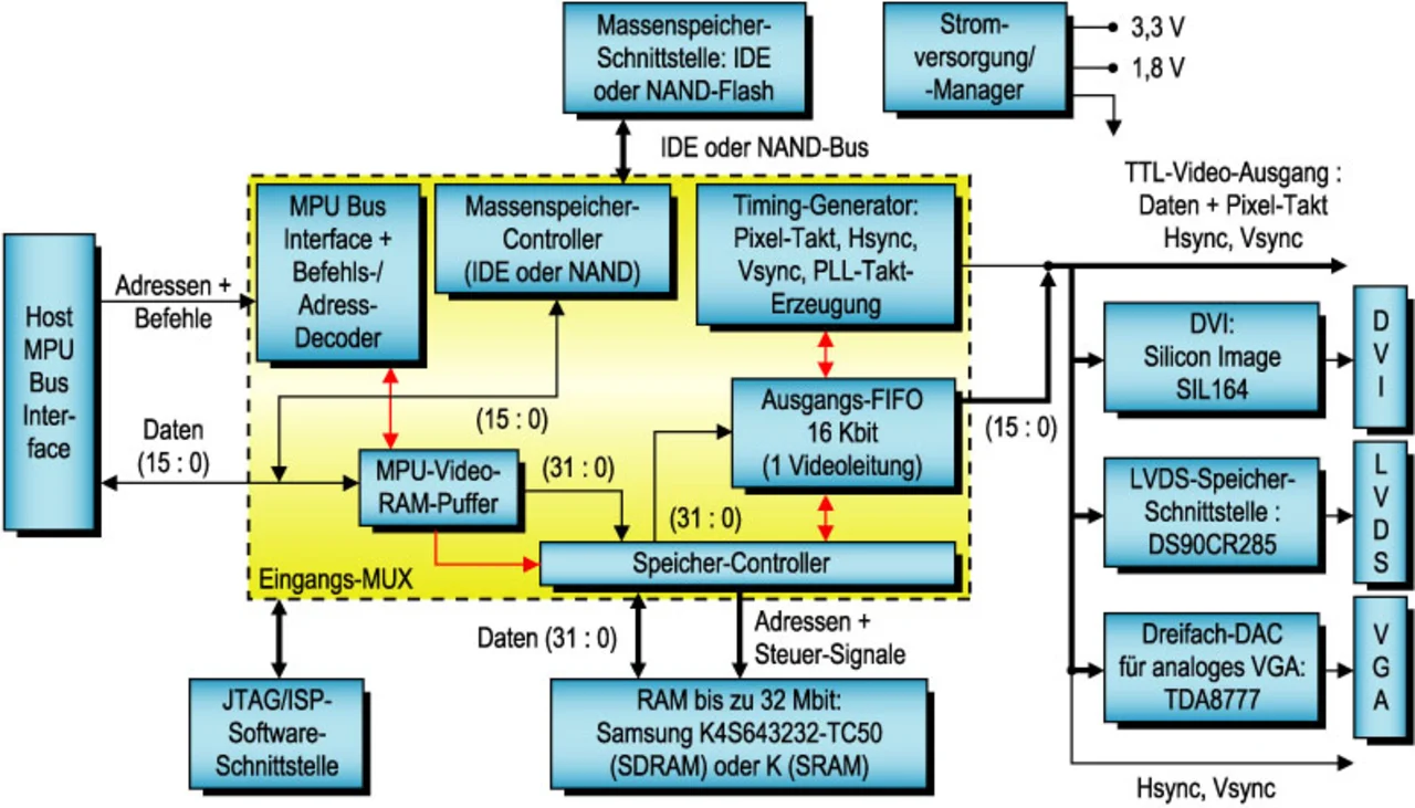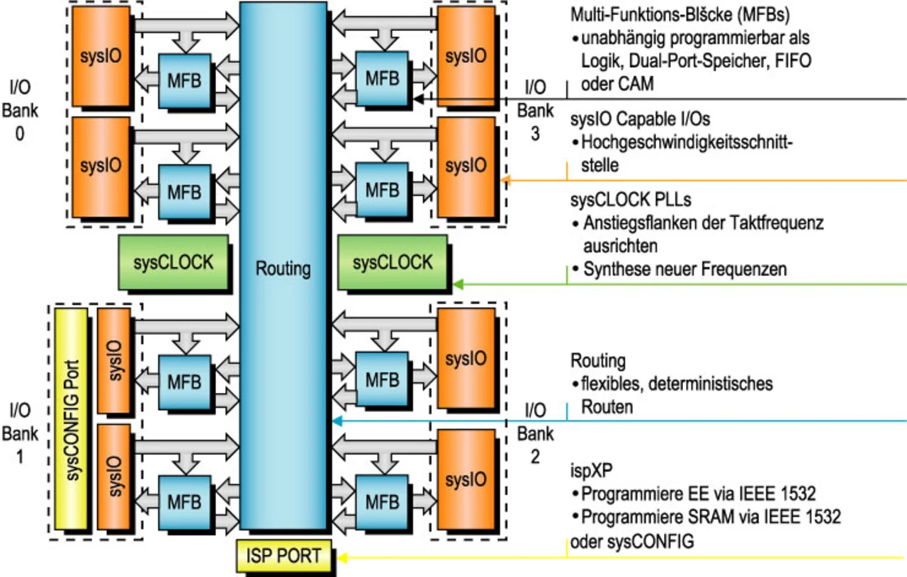 Mit Blick auf die hauptsächlichen Projektanforderungen hinsichtlich Geschwindigkeit, Speicherdichte und Verfügbarkeit einiger der grundlegenden Hardware-Bausteine wie Embedded-Speicher, PLL und Multistandard-Ein-/ Ausgabegeräte sind die Mitglieder der XPLD-Serie von Lattice Semiconductor eine ausgezeichnete Wahl. Bild 1 zeigt die internen Funktionsblöcke des MACH5000Mx: Die herkömmlichen Blöcke sind durch so genannte multifunktionale Blöcke (MFB) ersetzt, deren jeder eine der folgenden Funktionen ausführen kann: