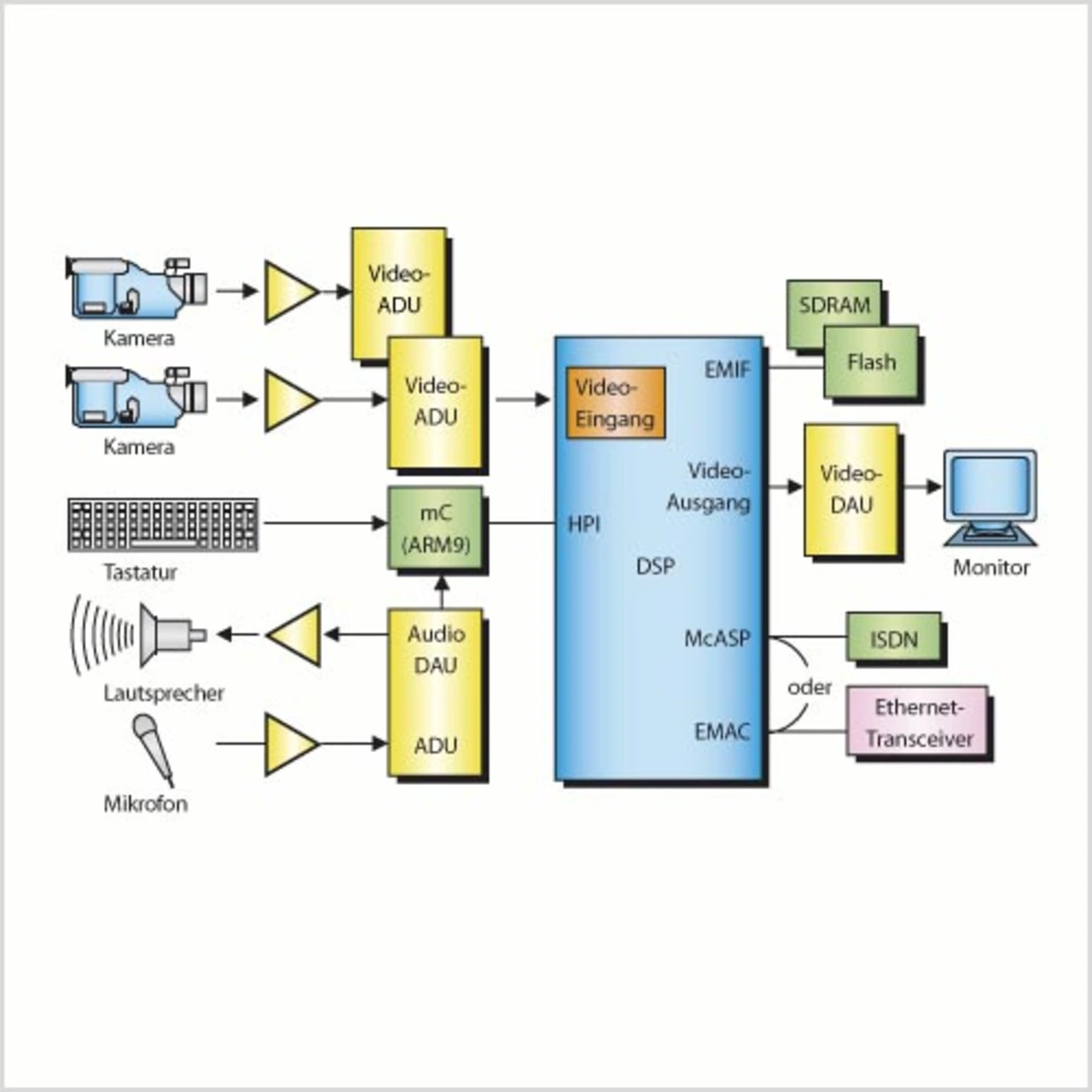 Bild 1 zeigt die Blockschaltung eines allgemeinen Videotelefons. Herzstück ist ein für Multimedia-Signalverarbeitung optimierter digitaler Signalprozessor (DSP). Aus Gründen der Interoperabilität verwenden nahezu alle Videotelefone standardbasierte Software-Komponenten. Dazu gehören unter anderem Video-Codecs (H.26x), Audio-Codecs (G.711, G.72x) sowie Übertragungs- und Steuerungsprotokolle für die Netzwerkübertragung (H.323, SIP, RTP, RTCP). Ein Codec besteht aus einem Encoder und einem Decoder. Die International Telecommunication Union (ITU, www.itu.int) definiert nur die Spezifikation des Decoders, um die Interoperabilität zu gewährleisten. Wie der Encoder implementiert wird, ist dem Hersteller überlassen. Die einzige Anforderung besteht darin, dass sein produzierter Datenstrom in einer Syntax vorliegt, die von jedem zugehörigen Decoder verstanden wird.