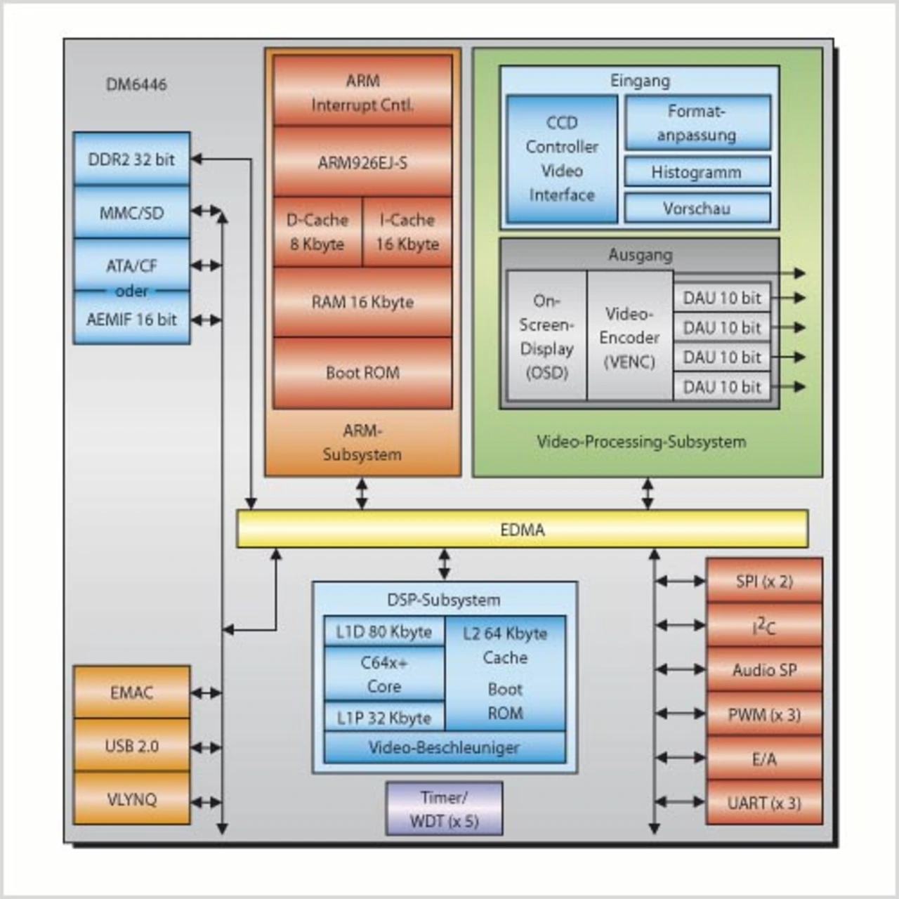 Der mit 300 MHz getaktete ARM9-Prozessor im SoC DM6446 eignet sich als Standard-Prozessor gut zur Übernahme von Aufgaben wie Systemwartung, Übertragungsprotokolle, GUI und sogar einfache Audiocodecs wie z.B. G.711. Auf dem ARM9-Prozessor läuft das Betriebssystem Monta Vista Linux oder WinCE 5.0 oder 6.0, das dem Benutzer eine Fülle von Open-Source-Anwendungen eröffnet, beispielsweise Netzwerkstacks (TCP IP), Multimedia-Anwendungen (mplayer, ffmpeg), Fenstersysteme (QTopia, X windows) und Browser (Java vss HTML). Alle Peripherie-Komponenten werden durch den ARM-Prozessor über Open-Source-Linux-Treiber angesprochen. Etablierte Linux-Treiber wie V4L2 (Video-Capture) oder FBDEV (Video-Darstellung) erlauben dem Benutzer direkten Zugriff auf das Video Processing Subsystem (VPSS). Das integrierte VPSS vereinfacht das Erfassen und Anzeigen von Video-Daten und entlastet gleichzeitig den DSP. Es bietet auch Unterstützung für gängige Verarbeitungsfunktionen eines Videotelefons, vom Skalieren über die Farbraumkonvertierung und statistische Berechnungen bis hin zum On-Screen-Display (OSD) mit Alpha-Blending. Das VPSS arbeitet parallel zum DSP und kann gleichzeitig zwei Videofenster (1 Vollbild, 1 Bild-im-Bild) und zwei zusätzliche Grafikfenster unterstützen. Das Bild-im-Bild-Verfahren ist eine gängige Funktion von Videotelefonen, da der Sprecher seine Position relativ zur Kamera überprüfen muss. Wahlweise kann auch eines der OSD-Fenster in die darunterliegenden Videofenster eingeblendet werden. Das VPSS erlaubt ferner die direkte Anbindung von CCD- und CMOS-Sensoren und kann auch Signale im Analog- oder Digitalformat ausgeben.