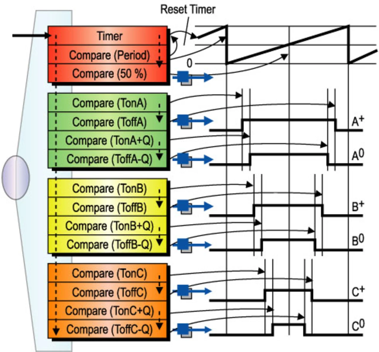 Es gibt verschiedene Wege, ein derartiges Motor-Management zu implementieren. Man kann z.B. zwei separate PWM-Signale – eine Standard-PWM und eine Center-PWM – mit kohärentem Update benutzen, um die erforderlichen vier Phasen zu realisieren. Versieht man beide noch mit einer automatischen Reload-Funktion, um die Geschwindigkeit des Motors durch andere Parameter in den PWM-Signalen zu ändern, dann benötigt man insgesamt zwölf LTC-Zellen – fünf für die Standard-PWM mit Reload-Funktion (eine Timer-Zelle und 2 x 2 Komparatoren) und sieben für die Center-PWM.