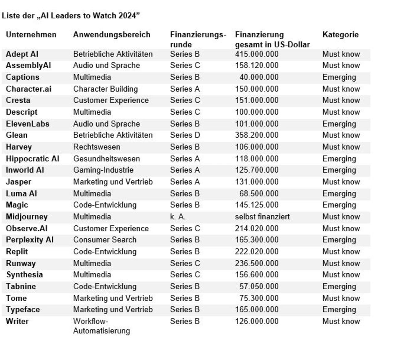 Identifiziert wurden die aufgelisteten 24 Unternehmen mithilfe einer datengestützten Auswertung, bei der das Gründungsjahr, die Finanzierung, das Ansehen bei Investoren, die Bekanntheit im Markt und die Zahl der Mitarbeitenden Ende des Jahres 2023 Berücksichtigung fanden. Die Gesamtfinanzierungszahlen geben den Stand bis 1. Mai 2024 wieder.