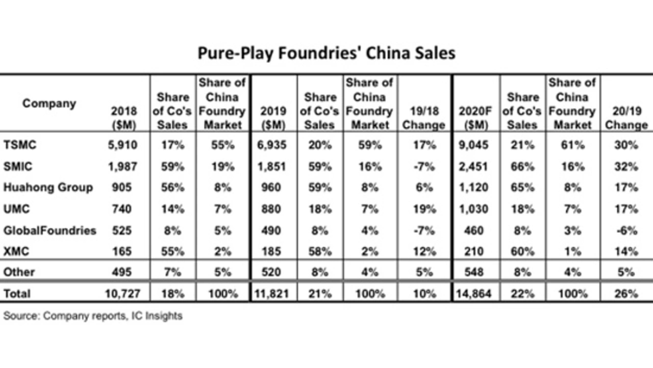 2020 wird der Umsatz chinesischer Foundries laut IC Insights um 26 Prozent in die Höhe schnellen, der von SMIC sogar um 32 Prozent.