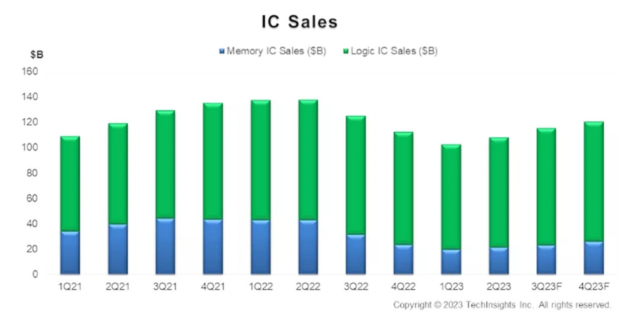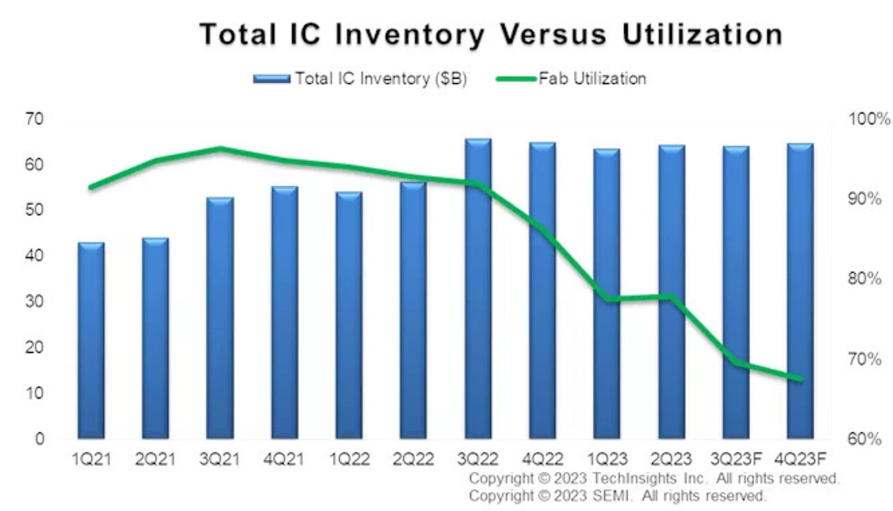 Trotz der Verbesserung der Elektronik- und IC-Verkäufe bleiben die Indikatoren für die Halbleiterfertigung schwach. Die Auslastung der Fabriken und die Investitionsausgaben gehen in der zweiten Jahreshälfte weiter zurück. Insgesamt wird erwartet, dass die Investitionen in Nicht-Speicher-Technologien im Jahr 2023 die Investitionen im Speicherbereich übertreffen werden, aber selbst die Ausgaben in den Nicht-Speicher-Segmenten haben begonnen, sich abzuschwächen. Die Gesamtinvestitionen in Q4 2023 bewegen sich auf dem Niveau von Q4 2020.