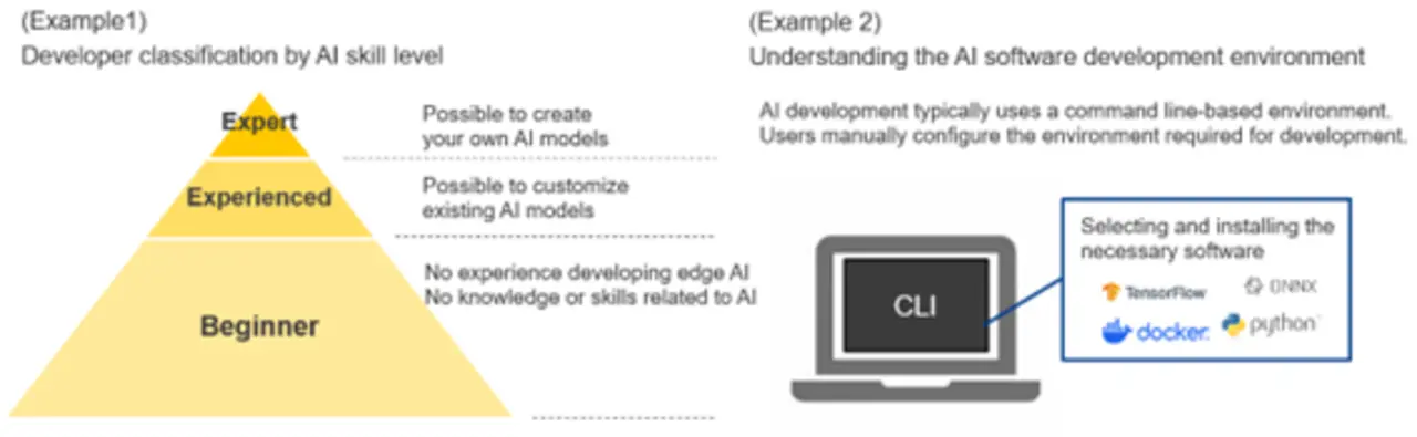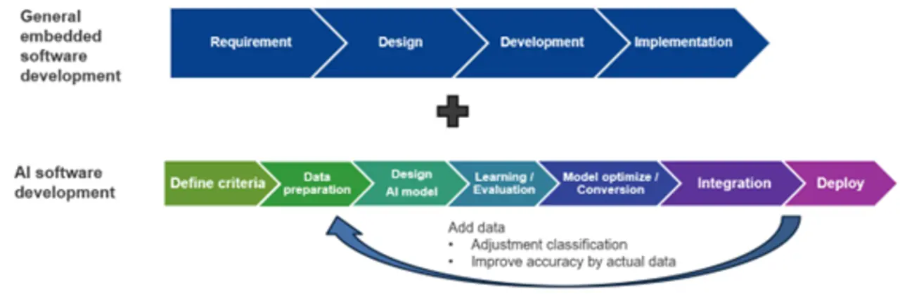 Zusätzlich zur Entwicklung regulärer Embedded-Software erfordert die Entwicklung von KI-Software einen ganz anderen Entwicklungsablauf. Zunächst werden die für das Training der KI notwendigen Daten gemäß den erforderlichen Spezifikationen gesammelt und ein KI-Modell entworfen. Nachdem das erstellte KI-Modell zum Trainieren der KI und zur Überprüfung ihrer Genauigkeit eingesetzt wurde, wird das trainierte KI-Modell optimiert und in ein Format umgewandelt, das sich auf dem Baustein ausführen lässt. Anschließend ist eine Reihe von Schritten erforderlich, um das KI-Modell in eine KI-Anwendung zu integrieren und auf dem eigentlichen Baustein bereitzustellen. Wenn die Genauigkeit auf dem Baustein nicht ausreicht, müssen Daten hinzugefügt werden, um die Genauigkeit zu verbessern. Diese Entwicklungsschritte müssen viele Male wiederholt werden.