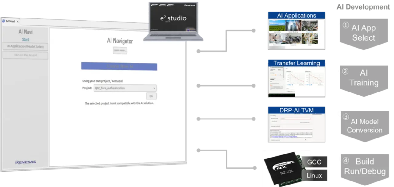 Aufgrund dieser Herausforderungen ist es laut Renesas für viele Kunden schwierig, in die Entwicklung von KI-Software einzusteigen. Renesas stellt deshalb den AI Navigator als Entwicklungsumgebung für bildverarbeitende KI bereit. Dieser ist insbesondere auch für Kunden geeignet, die gerade erst mit der Entwicklung von Embedded AI beginnen.
