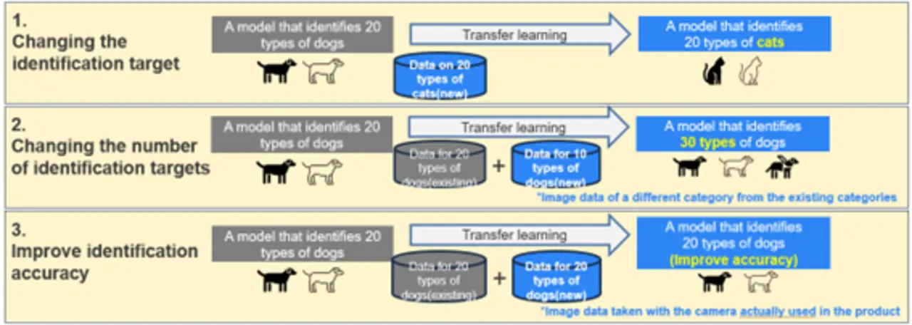 Angenommen, ein Modell kann 20 verschiedene Hunderassen identifizieren. Wenn ein Bild eines Hundes in dieses KI-Modell eingegeben wird, schätzt es, welcher Hunderasse er ähnelt, und gibt die wahrscheinlichste Hunderasse aus. Soll ein KI-Modell erstellt werden, das anstelle von Hunden 20 verschiedene Katzenarten identifizieren kann, werden Bilddaten von 20 verschiedenen Katzenarten benötigt. Ein KI-Modell, das Katzen identifizieren kann, lässt sich mithilfe einer KI-Lernmethode namens Transferlernen erstellen. Dabei werden das ursprüngliche Modell zur Identifizierung von Hunden und Bilddaten von Katzen verwendet. Der AI Navigator unterstützt dieses Transferlernen, so dass die Anwender es einfach im Tool ausprobieren können.