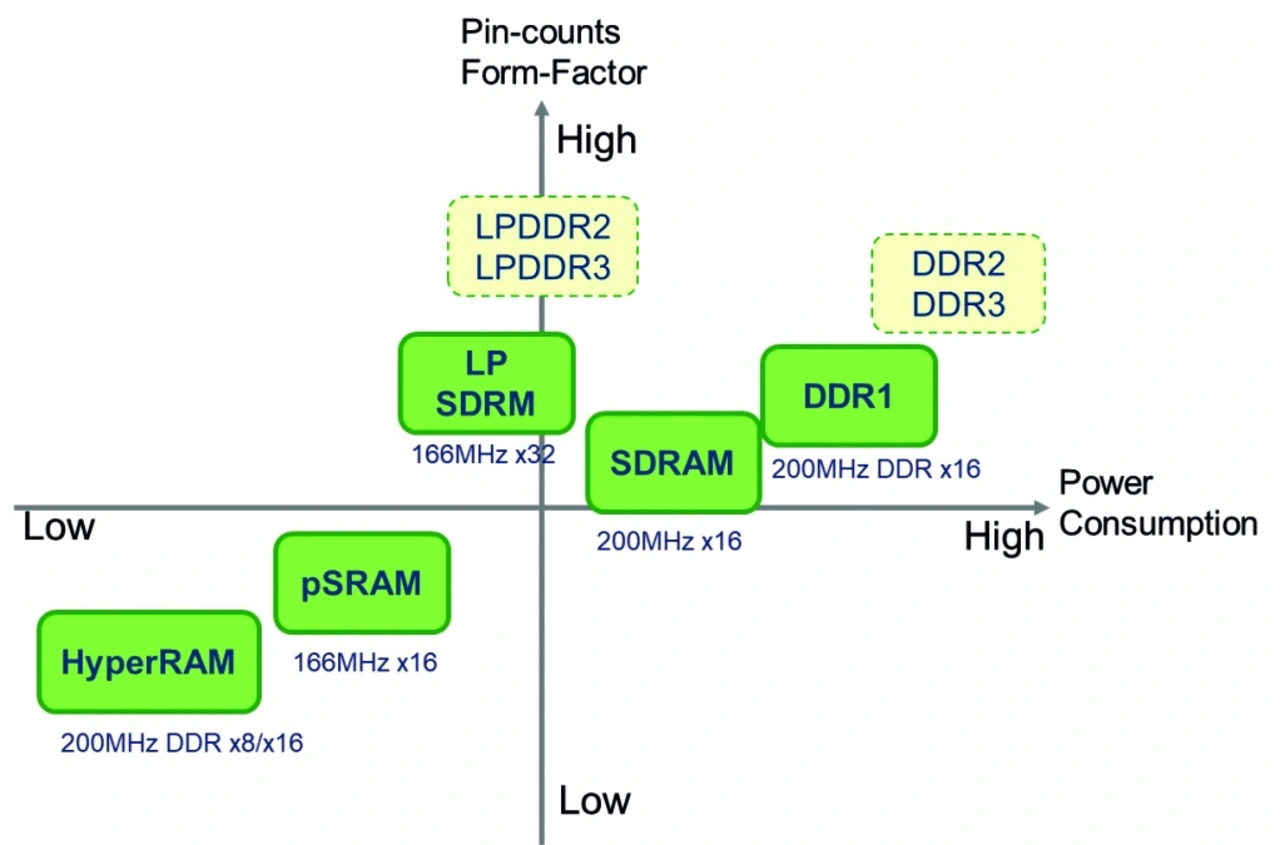 Die HyperRAMs arbeiten also bei gleicher Bandbreite mit weniger Pins und sie erreichen eine geringere Leistungsaufnahme. Außerdem bietet HyperRAM ein neues HyperBus Interface, für das sich die Anwender entscheiden können.