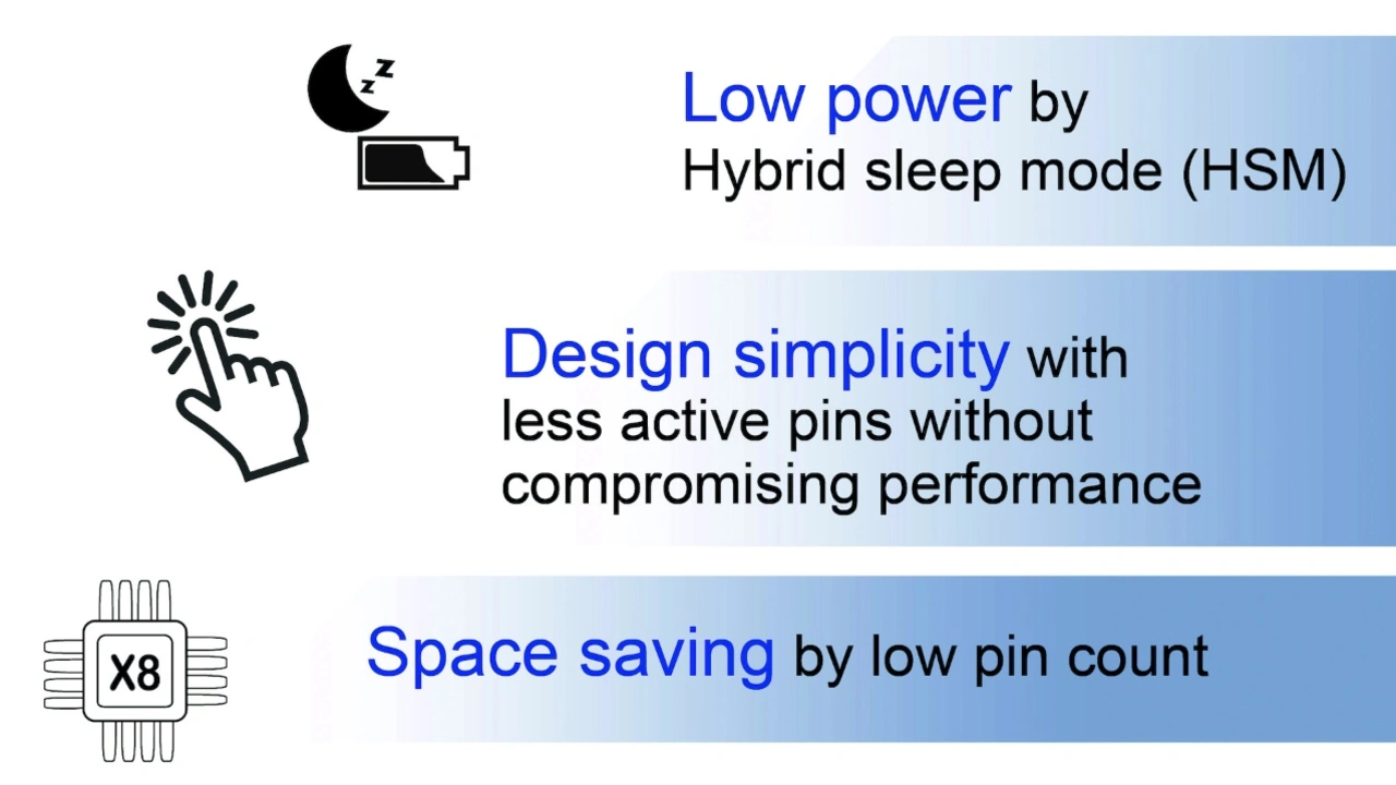 Diese Vorteile seien an einem Beispiel erläutert: Der 64-Mbit-HyperRAM von Winbond erreicht an einer Spannung von 1,8 V eine Leistungsaufnahme im Standby-Modus von 90 µW. Zum Vergleich: Ein SDRAM gleicher Speicherkapazität nimmt an 3,3 V eine Leistung von 2000 µW auf. Darüber hinaus begnügen sich die HyperRAMs im Hybrid Sleep Mode mit einer Leistungsaufnahme von 45 µW an 1,8 V und 55 µW an 3,3 V – was ebenfalls deutlich unter der Leistungsaufnahme vergleichbarer SDRAMs liegt.