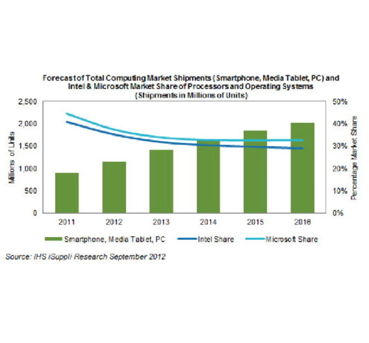 Die am schnellsten wachsenden Mobilgeräte sind Smartphones und Tablets, die viele Aufgaben ausführen können, die in der Vergangenheit nur auf PCs realisierbar waren. In einer Studie von IHSiSuppli, in welcher PCs, Smartphones und Tablets als “neuer Computermarkt” definiert sind, wird Microsoft im Jahr 2016 nur noch ein Marktanteil von 33 % vorhergesagt (2011 waren es noch 44 %). Noch härter trifft es laut HIS Intel, dessen Marktanteil bei Prozessoren von 41 % in 2011 bis 2016 auf nur noch 29 % fallen soll (Bild).