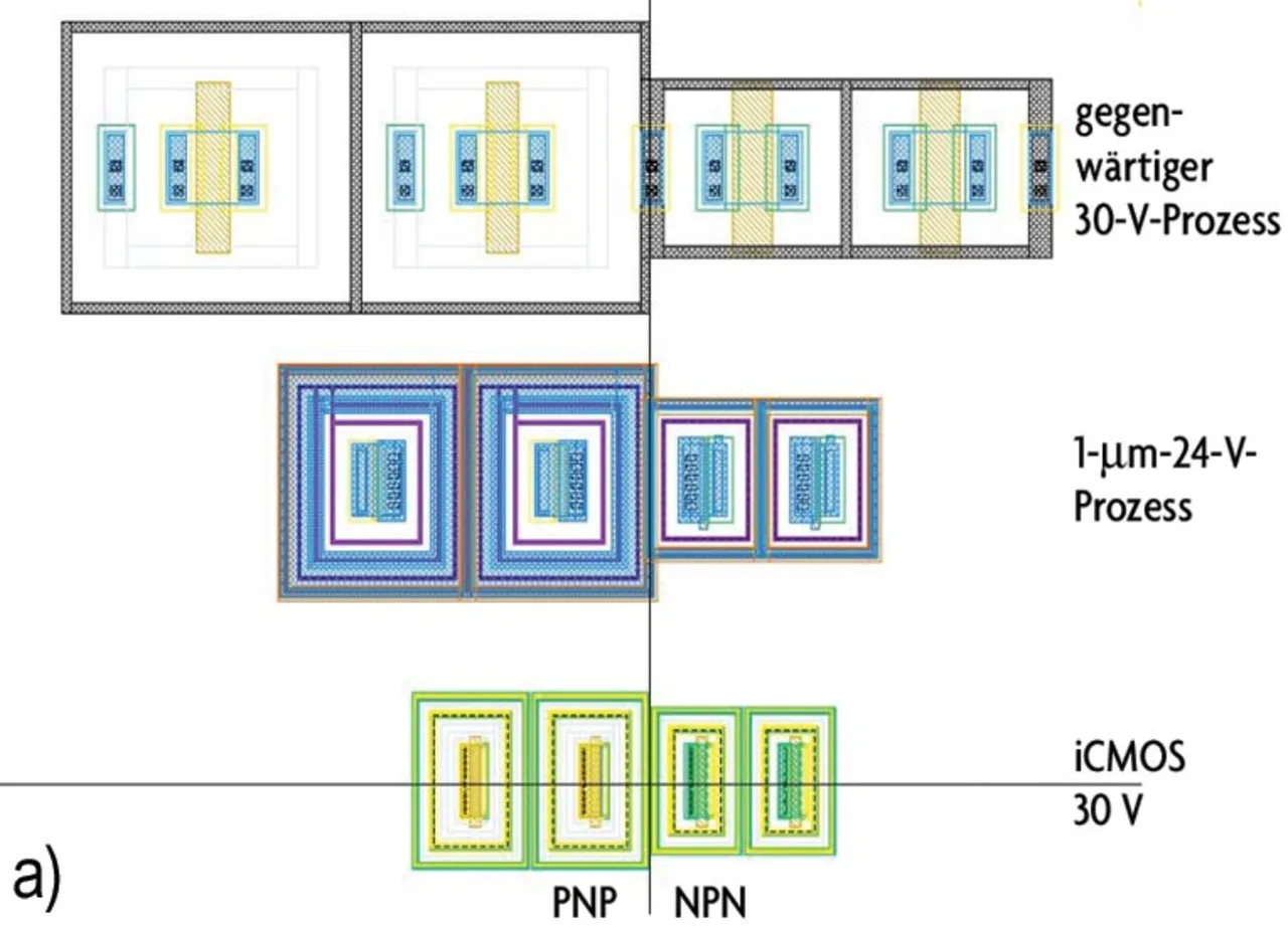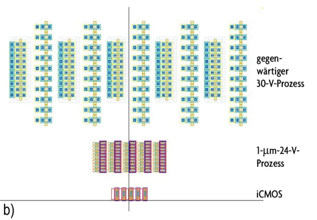 Neben den Hochvolt-MOS-Schaltkreisen können ICs in iCMOS-Technik komplementäre Bipolar-Transistoren umfassen, die ebenfalls für hohe Versorgungs- und Signalspannungen ausgelegt sind. Die zahlreichen Schaltungskomponenten, die der iCMOS-Prozess anbietet, bilden die Grundlage eines völlig neuen Leistungsspektrums bei der Chip-Integration (Bild 1). Hinter iCMOS verbirgt sich ein modularer Fertigungsprozess für integrierte Schaltungen, bei dem die Leistung und die Spannungsfestigkeit der zugehörigen Schaltungselemente nicht auf den herkömmlichen Kompromissen basieren. Als 0,6-µm-Prozess ermöglicht iCMOS die Integration moderner digitaler Logik zusammen mit Hochvolt-Analog-Schaltkreisen auf einem gemeinsamen Chip. Die iCMOS-Schaltkreise weisen deshalb gegenüber bisherigen Hochvolt-IC-Generationen verbesserte Eigenschaften auf, verfügen über wesentlich mehr integrierte Funktionen, benötigen weniger Strom und deutlich weniger Platz.