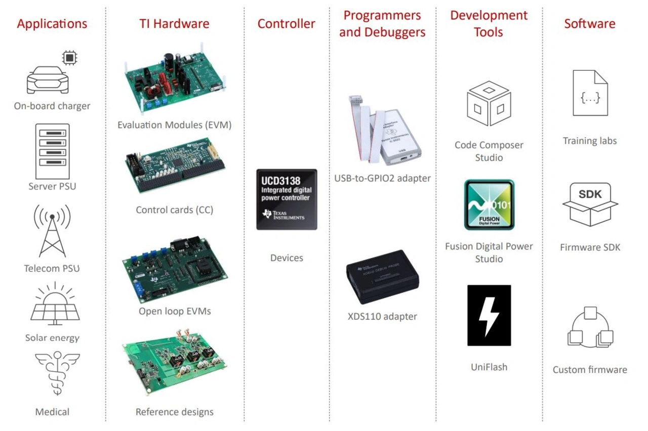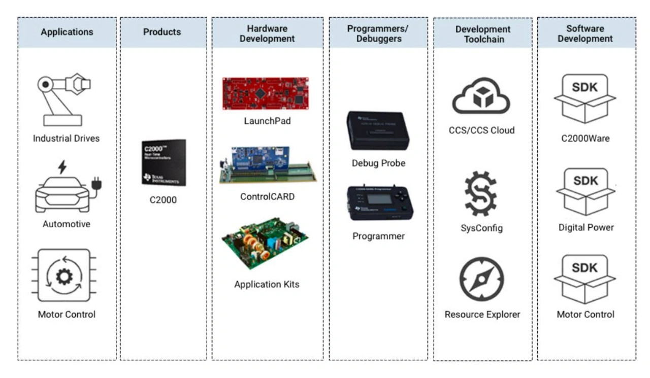 In Bild 2 ist des Ecosystem zu den Echtzeit-MCUs der C2000-Familie zu sehen, das unterschiedliche Anwendungen, Produkte, Hardware-Plattformen, Entwicklungswerkzeuge und Software-Development-Kits abdeckt.