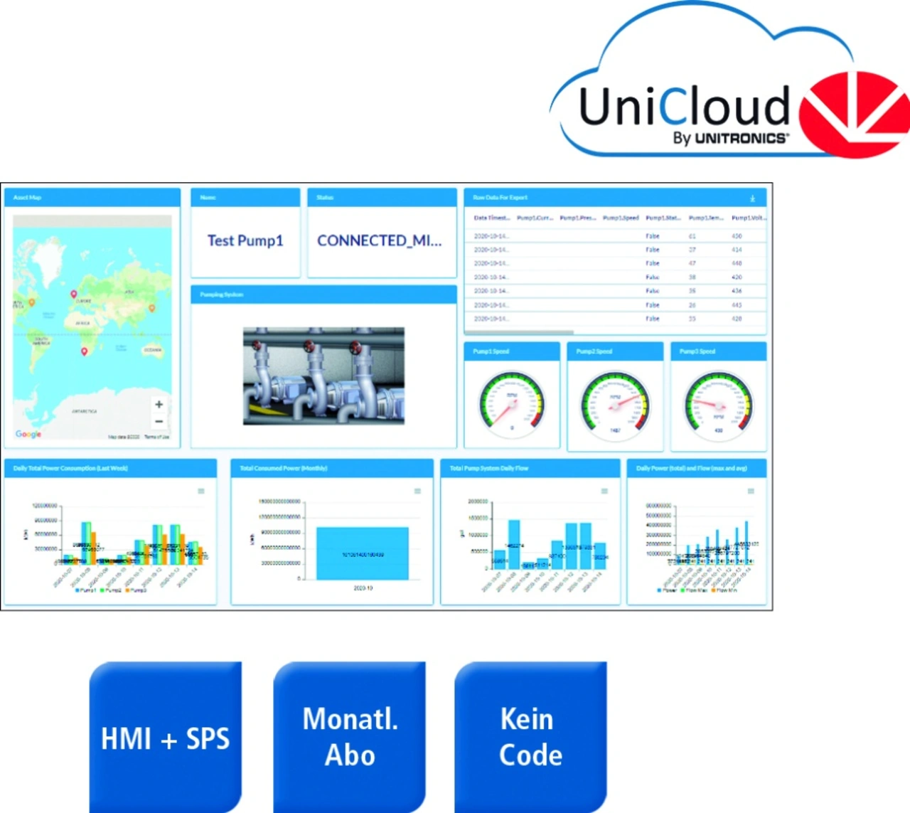 All UniStream, Samba and Vision series PLC models can be connected to UniCloud. Both in new installations and in existing running installations, without the need for program changes. UniCloud subscriptions are available in different packages, depending on the amount of data and the update rate, which can be selected between ten seconds and five minutes. According to Spectra, UniCloud is free of charge for the first three months and can be tested extensively for one's own digitization projects via simple registration, without any functional restrictions.