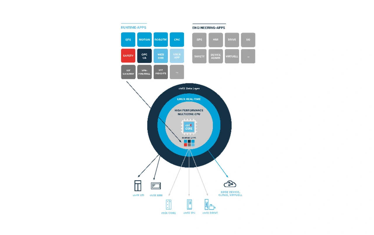 To be able to use the advantages of an open standard, Bosch Rexroth has developed the automation platform »ctrlX Automation«, which is based on Linux. With this platform, the company wants to offer its customers a complete automation solution from a single source. With more than 30 communication interfaces for IT systems and the IoT, it ensures simple networking of machines in the factory of the future. The system functions of ctrlx Automation can be extended with apps as well as third-party hardware and software. The user can freely choose the development environment and programming language.