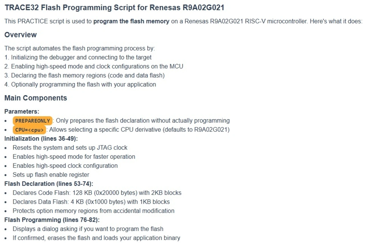Philipp Foth, AI engineer at Lauterbach, explains a typical use case: »New developers at our customers are given existing scripts in our powerful PRACTICE language and tasked with extending or modifying them. To do this, however, they first need to understand what their colleagues have programmed. Of course they could already do this step by step using the comprehensive TRACE32 documentation, but now they can simply ask the chatbot ‘I have received a PRACTICE script and don't know what it does’ and receive a comprehensive analysis of exactly what each line of code does.« Figure 1 shows the output for a PRACTICE script that programs the flash memory of a microcontroller.