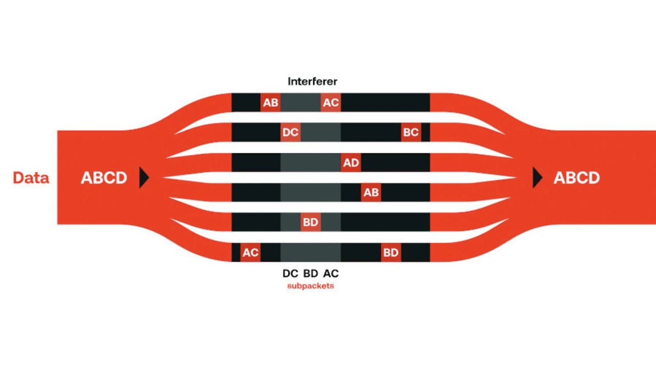By using several algorithms in the mioty base station, it is possible to reconstruct the complete data packet using the received sub-packets. Unlike other LPWAN protocols, which are significantly more susceptible to interference during telegram transmission, mioty offers a much higher robustness due to its unique telegram splitting method and the use of different algorithms. Ideally, a mioty base station needs to receive only 50% of the sent data packet correctly to be able to reconstruct the complete data. The mioty protocol reduces the Packet Error Rate (PER) many times over. Especially in times of massively increasing wireless data transfer due to advancing digitization and the associated growing number of interferences, this technology with its very high reliability offers a decisive advantage.