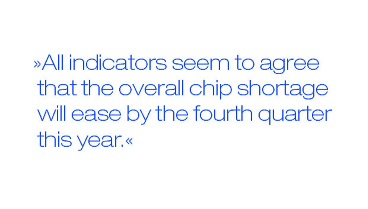 All indicators seem to agree that the overall chip shortage will ease by the fourth quarter this year, but some industries, such as the automotive industry, have longer supply chains and for these it could take much of 2022 to get back to normal.