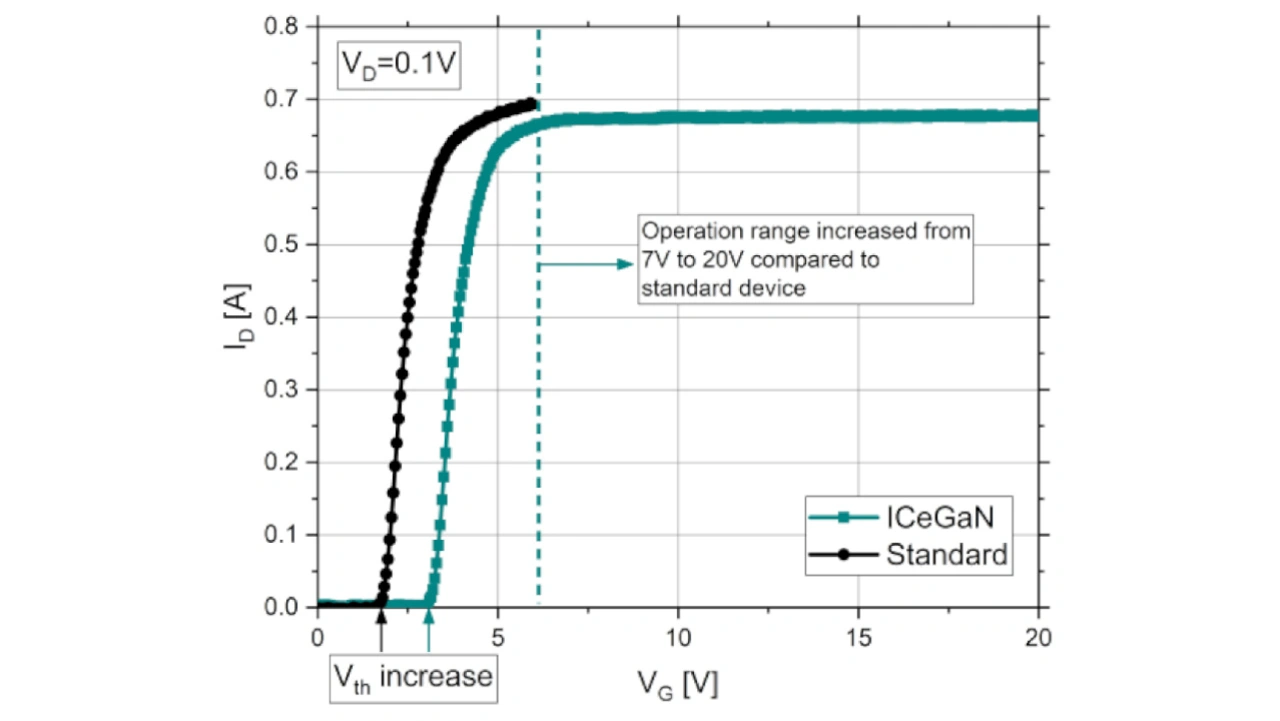 This is not possible with conventional solutions, since the voltage applied to the HEMT's gate is not regulated as a function of the operating temperature. In contrast, in ICeGaN devices, the auxiliary gate transistor is configured to absorb more voltage at lower temperatures, limiting the maximum voltage at the internal gate to a lower value (below 5.5 V). This increases the reliability of the device significantly.