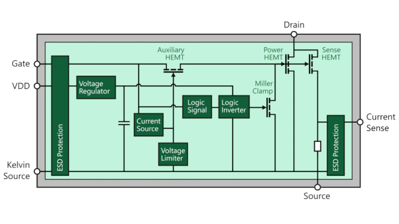 An important feature of the ICeGaN devices is the monolithically integrated Miller clamp. This accomplishes a dual purpose; on the one hand, it ensures that the main HEMT remains switched off even during fast switching or external transients, and on the other hand, it ensures that the main HEMT switches off quickly when the clamp is activated.