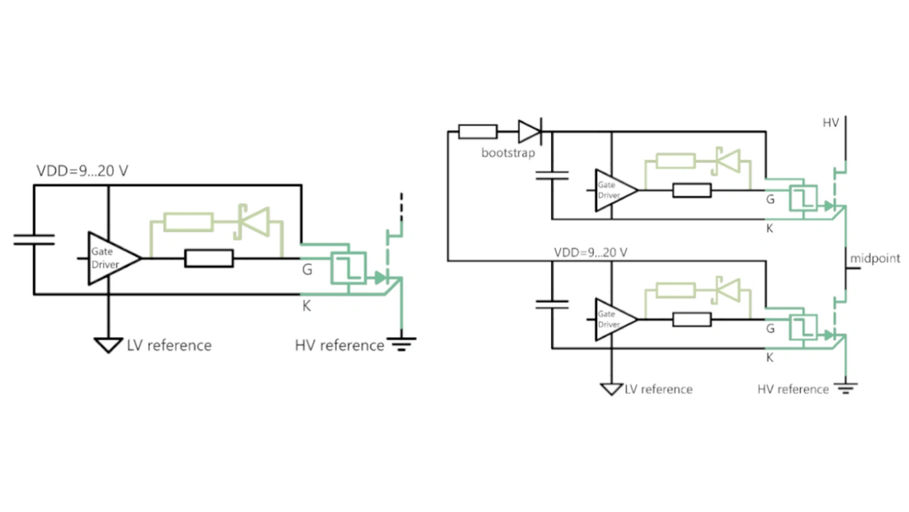 If the driver is fully integrated, these parasitic effects can be reduced. However, this deprives the user of the flexibility to use low-cost, high-performance silicon-based gate drivers or gate drivers with integrated high-performance controllers. In addition, the monolithically integrated gate driver can cause additional losses due to the self-heating of the power transistor because of the thermal coupling on the chip. Furthermore, a fully integrated solution is difficult to be scaled up to higher power levels.