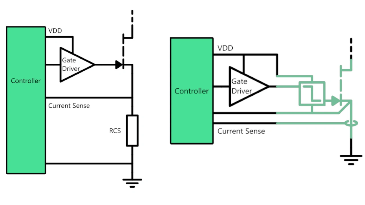 In many power electronic systems, it is necessary to continuously monitor the current through the transistor in order to provide the necessary input data to the control chip. In conventional silicon MOSFETs and GaN transistors, a shunt resistor is connected in series with the transistor for this purpose (Figure 5, left). A voltage of typically up to 1 V is dropped across this resistor; this signal is fed into the control circuit.