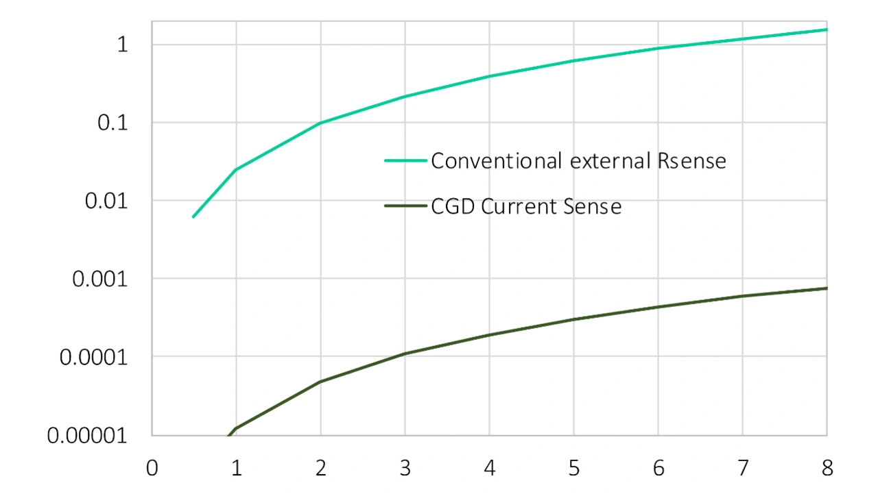 In ICeGaN devices, the current measurement is monolithically integrated on the chip, making a series resistor obsolete (Figure 5, right). This overcomes all three major drawbacks of the conventional configuration. With conventional solutions, the entire current to be sensed passes through the additional resistor. This causes extra losses and reduces system efficiency. As a first point, CGD's solution reduces these losses to a fraction (Figure 6).