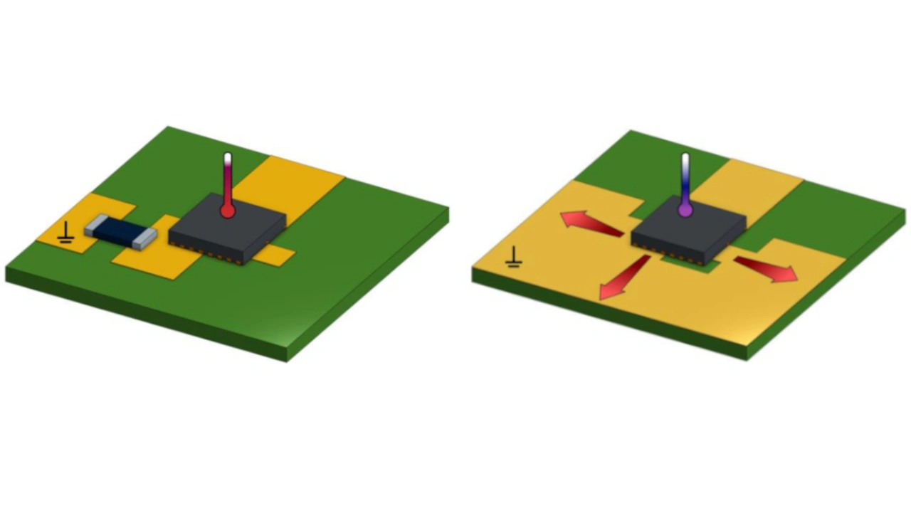 The third challenge addressed by current sensing with ICeGaN devices relates to heat dissipation. As already mentioned, the source connection of the main HEMT is on ground potential. This means that these devices can be directly thermally connected to the ground plane, the largest piece of copper on the system board and is therefore ideal for dissipating and distributing the waste heat from the components (Figure 7).
