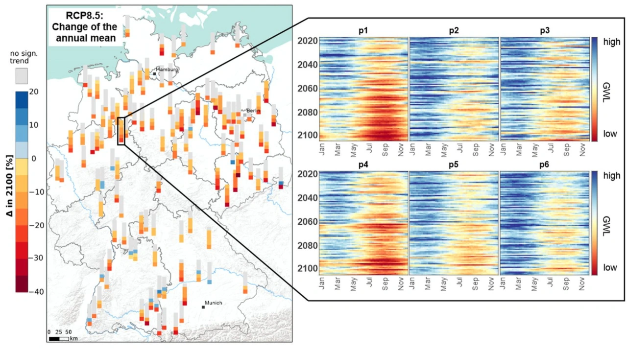 The experts from BGR and KIT used artificial intelligence in various forecast models to investigate how climate change will affect groundwater resources in Germany in the 21st century. For this purpose, they used machine learning methods (deep learning) to evaluate the development of groundwater levels at various locations on the basis of existing groundwater data from all over Germany using different climate scenarios taken from the IPCC's Fifth Assessment Report.