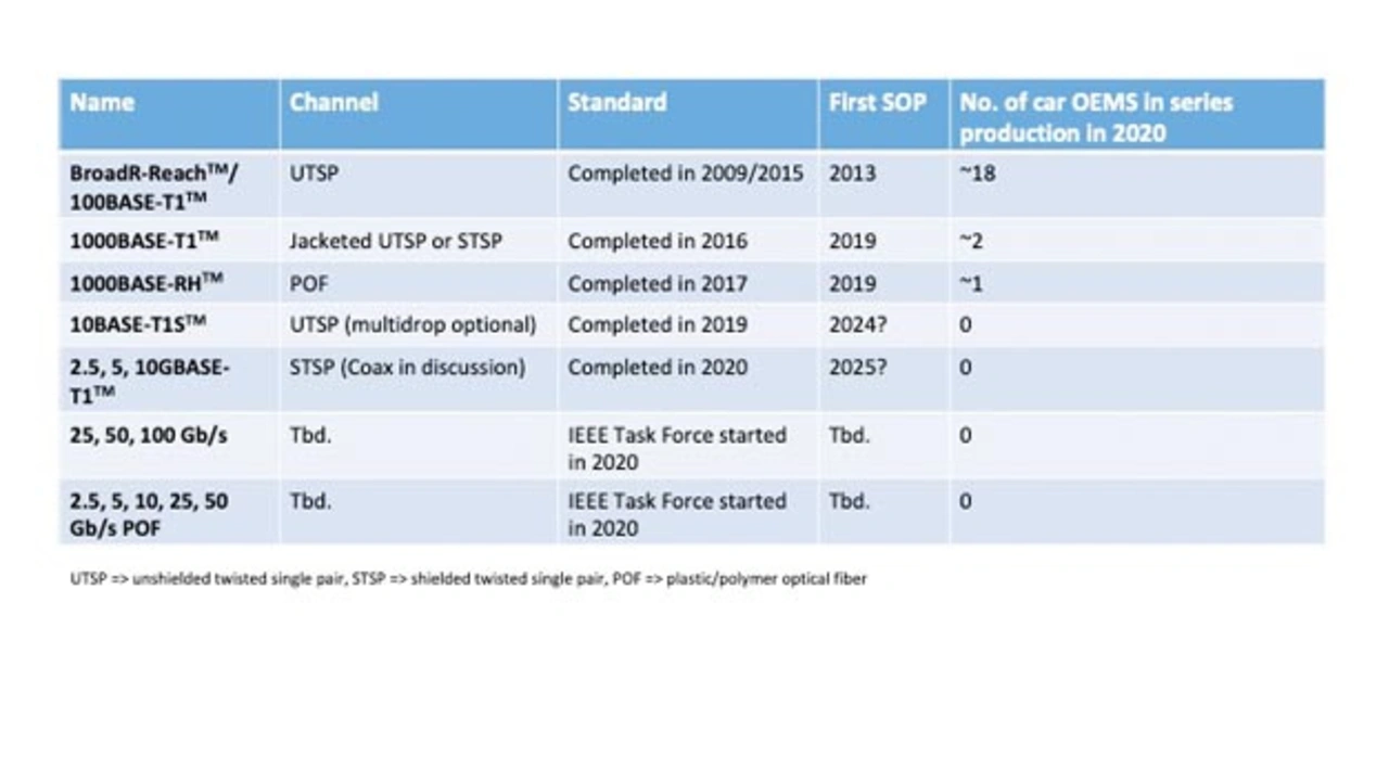First of all, what has been achieved on the path toward Ethernet as the globally accepted IVN foundation so far is significant. A vast number of industry player across the complete eco-system started as early as 2011 to support the industrialization of Automotive Ethernet in a number of organizations such as the OPEN Alliance, the Avnu Alliance, the International Electrotechnical Commission (IEC), and the International Organization for Standardization (ISO). The technology allowing to transmit a data rate of 100 Mb/s over unshielded cabling – now called 100BASE-T1 and published as IEEE 802.3bw in 2015 – had been introduced into series production cars as early as 2013. By the end of 2020, 100BASE-T1 will have been introduced into series production cars by all major car manufacturers. The next generation 1 Gbps technologies 1000BASE-T1/IEEE 802.3bp and 1000BASE-RH/ IEEE 802.3bv have seen their first SOPs in 2019.