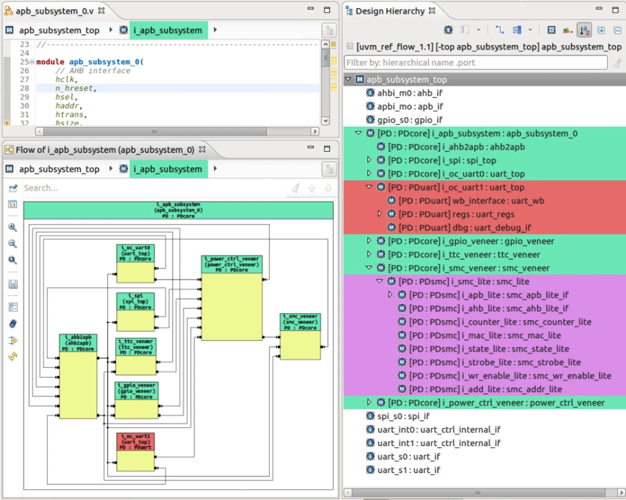 Figure 1 shows an example specifically relevant to low-power design. The IDE has read in the power intent specification as well as the other design and verification files and has determined the power domains. Each domain has a unique color that is shown in both the hierarchy browser and schematic views. This screenshot and the others that appear in the following examples are from the Design and Verification Tools (DVT) Eclipse IDE from AMIQ EDA.