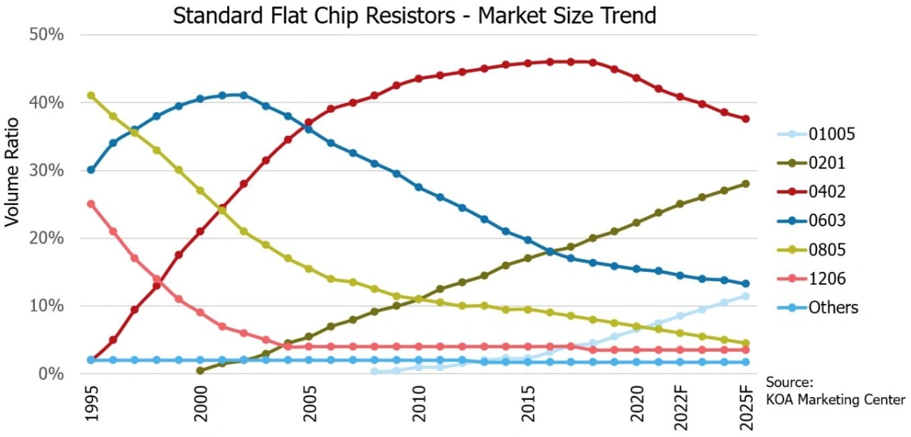 What the above means is that as the market continues to downsize, the availability for the higher case sizes of 0603 – 1206 will become more restricted in the future. To support this market trend, KOA is heavily investing in case sizes 0402 and below to support the conversion to smaller sizes.
