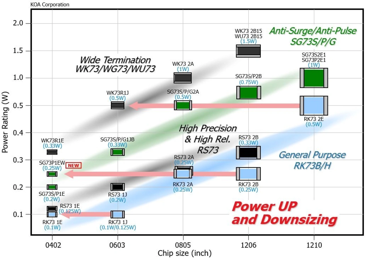 The above graphic shows that a typical 0805 or 1206 resistor can be designed out in favour of a smaller pulse tolerant SG73 in an 0402 size, or a WK73 wide terminal part in 0204 size.