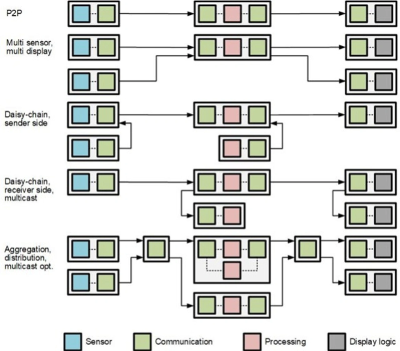 The scenario often associated with (camera) sensor and display links is Point-to-Point (P2P) connectivity, which is depicted in the top row of Figure 1. In case of P2P, a single sensor or display is connected to a single (video) data processing unit by a direct, dedicated link in a one-to-one relationship. Note that while this scenario seems typical, it is actually not that likely, especially in any forward-looking architecture. Figure 1 therefore shows other architecture options. These include multiple sensors, displays or processors, which share communication as well as processing power, which are daisy-chained, whose video streams are aggregated or distributed among different units or distributed within one unit to/from different processors, or whose data streams are multi-casted. Real architectures are likely to be a mix of all depicted options. The selected security concept thus needs to support all.