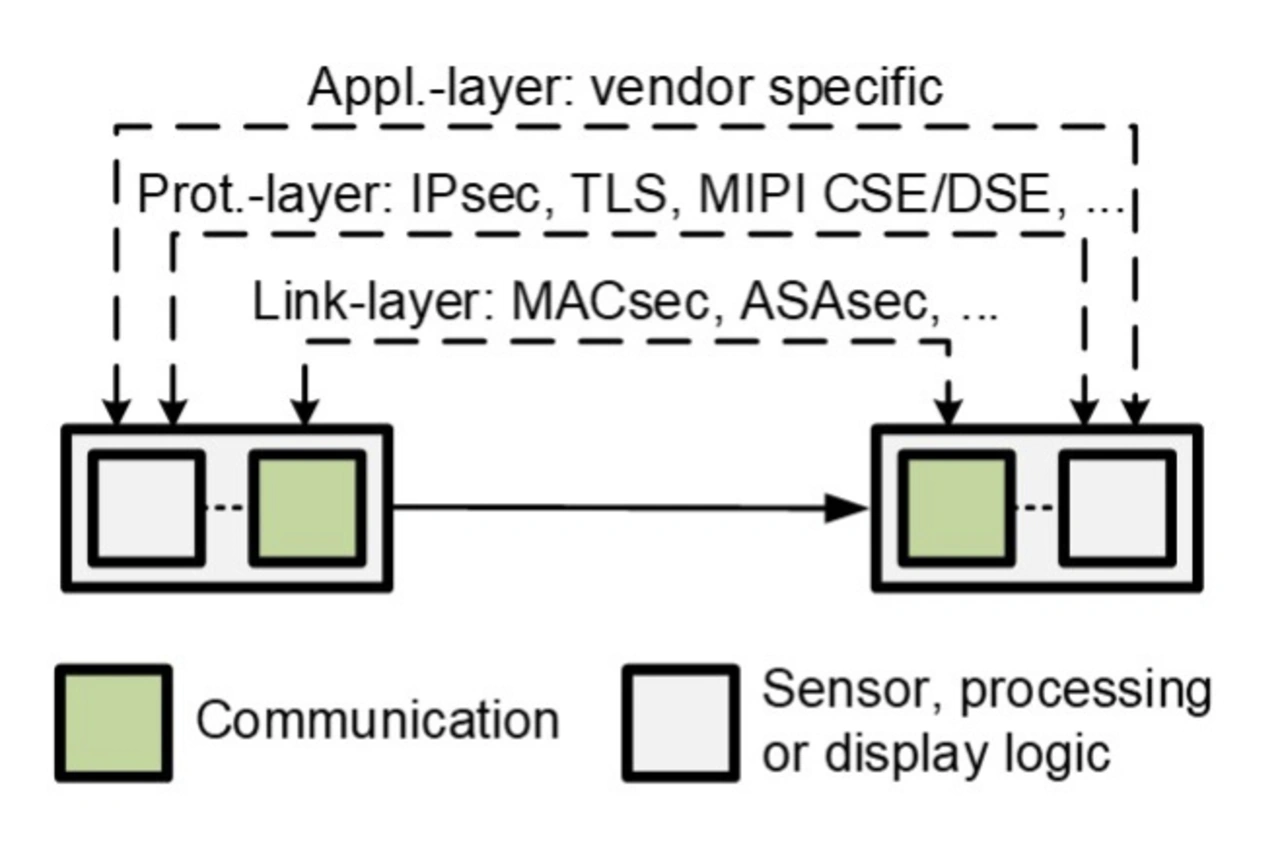 Security mechanisms can be applied to different layers of the communication protocol stack. For the sake of this article, we distinguish between link-based, protocol-based, and application-based security only. Link-based security protects the physical layer of the communication technology and starts and ends in the communication chip (see Figure 2). Examples are MACsec for Ethernet or the ASAsec for the ASA Motion Link. Protocol-based security is a mechanism applied to a higher layer protocol that would typically start and end in the chips that generates, processes, or displays the sensor/video data (see also Figure 2). Examples are IPsec, Transport Layer Security (TLS) for Ethernet or the security defined with the MIPI Camera/Display Service Extension (CSE/DSE). Finally, any sensor or video processing chip can add authentication or encryption on application level, which would also end in the sensor, display, and processing chips and which is typically vendor specific. This means that should the two end chips be from two different vendors, they have to have the respective knowledge and capabilities concerning the security supported by the respective other chip.